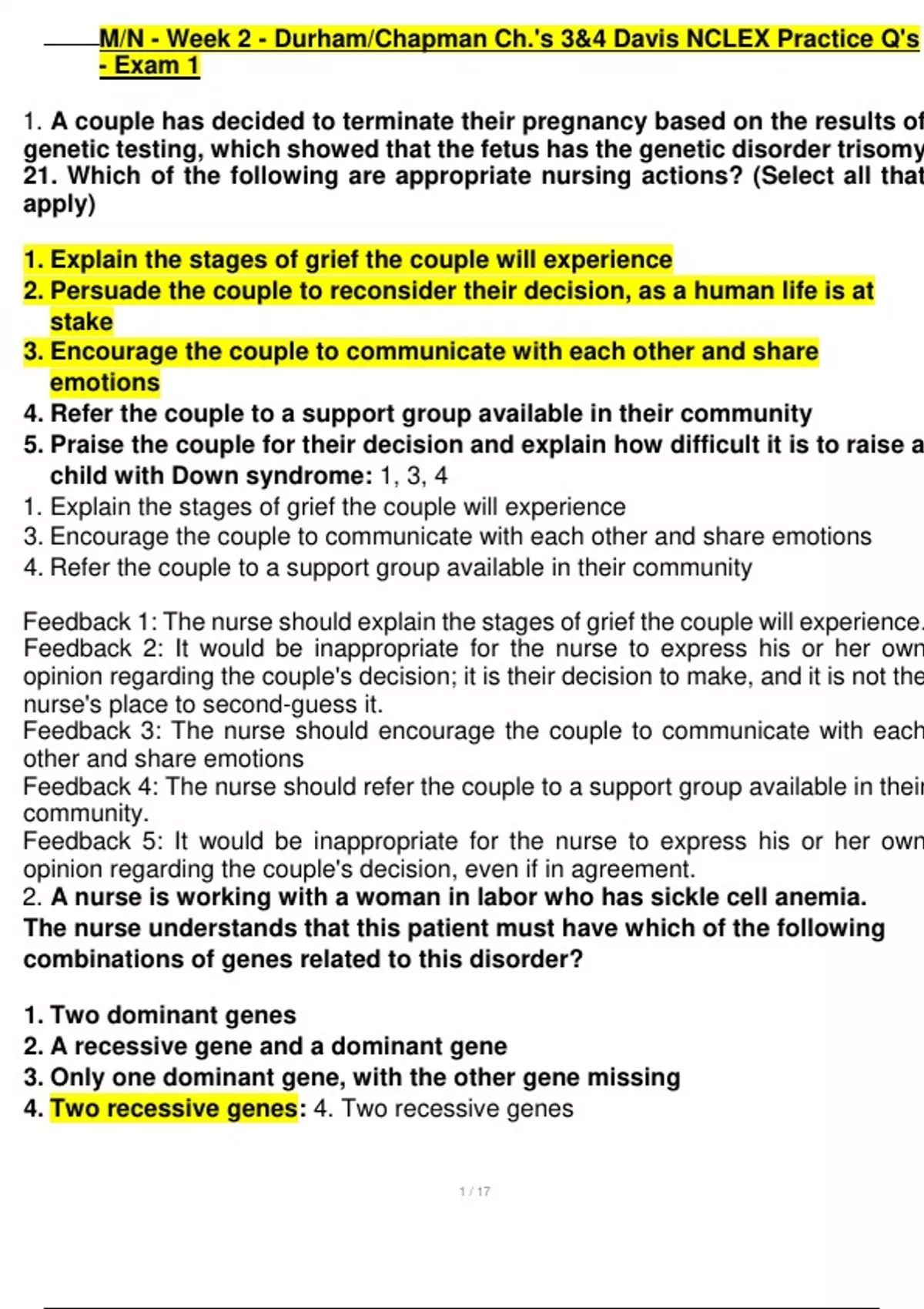 Feedback 1: The nurse should explain the stages of grief the couple will experience.