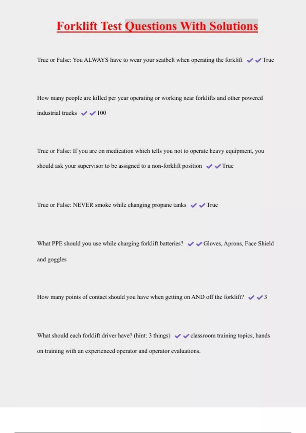 Forklift Test Questions With Solutions True or False: You ALWAYS have to wear your seatbelt when operating the forklift True How many people are killed per year operating or working near forklifts and other powered industrial trucks 100 True or False: If you are on medication which tells you not to operate heavy equipment, you should ask your supervisor to be assigned to a non-forklift position True True or False: NEVER smoke while changing propane tanks True What PPE should you use while charging forklift batteries? Gloves, Aprons, Face Shield and goggles