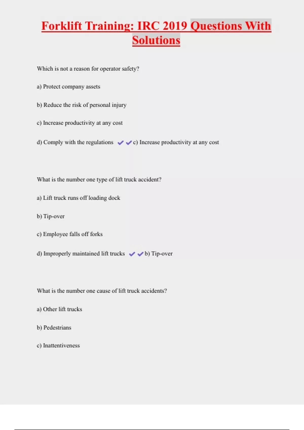 Forklift Training: IRC 2019 Questions With Solutions Which is not a reason for operator safety? a) Protect company assets b) Reduce the risk of personal injury c) Increase productivity at any cost d) Comply with the regulations c) Increase productivity at any cost What is the number one type of lift truck accident? a) Lift truck runs off loading dock b) Tip-over c) Employee falls off forks d) Improperly maintained lift trucks b) Tip-over