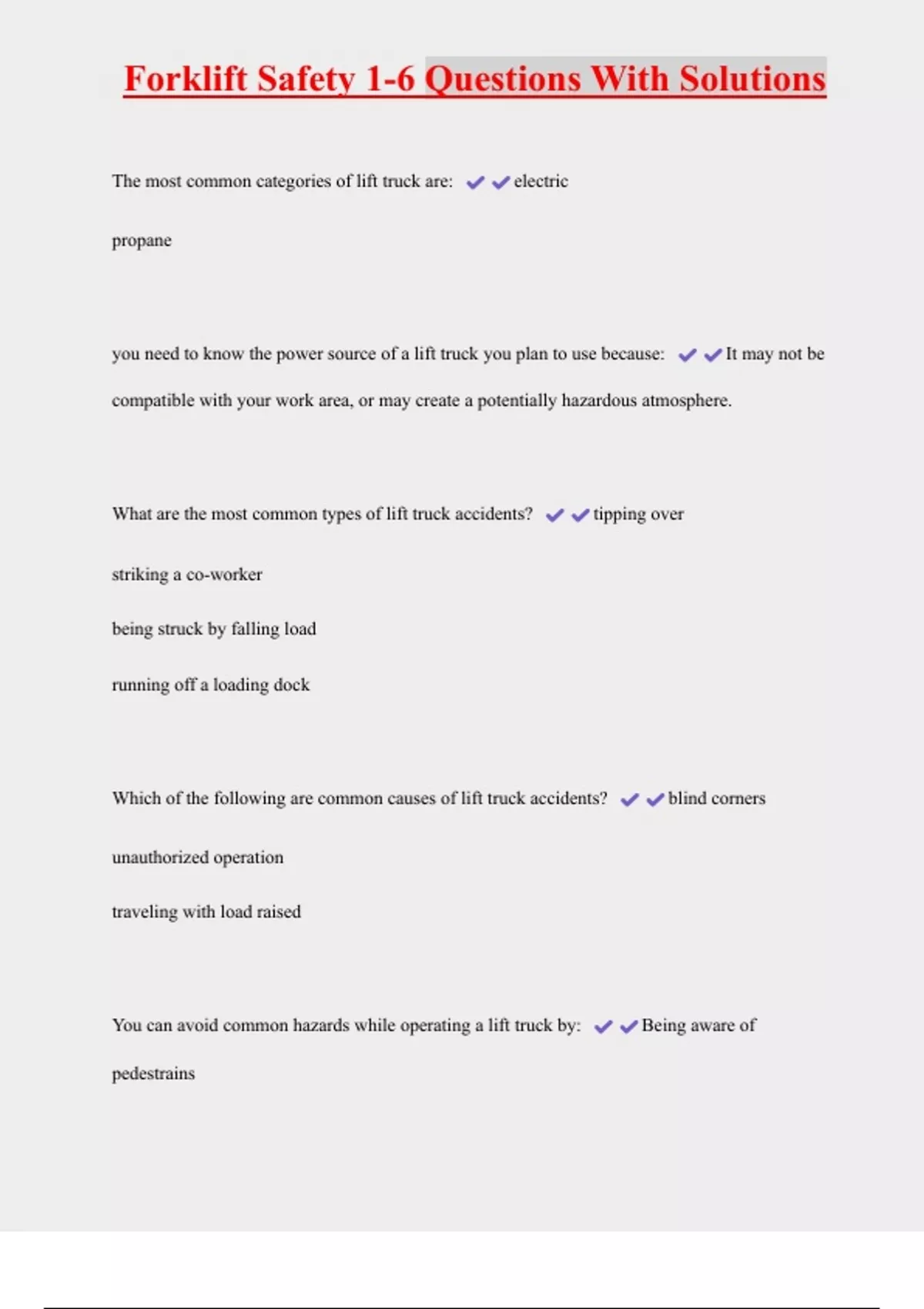 Forklift Safety 1-6 Questions With Solutions The most common categories of lift truck are: electric propane you need to know the power source of a lift truck you plan to use because: It may not be compatible with your work area, or may create a potentially hazardous atmosphere. What are the most common types of lift truck accidents? tipping over striking a co-worker being struck by falling load running off a loading dock Which of the following are common causes of lift truck accidents? blind corners unauthorized operation traveling with load raised