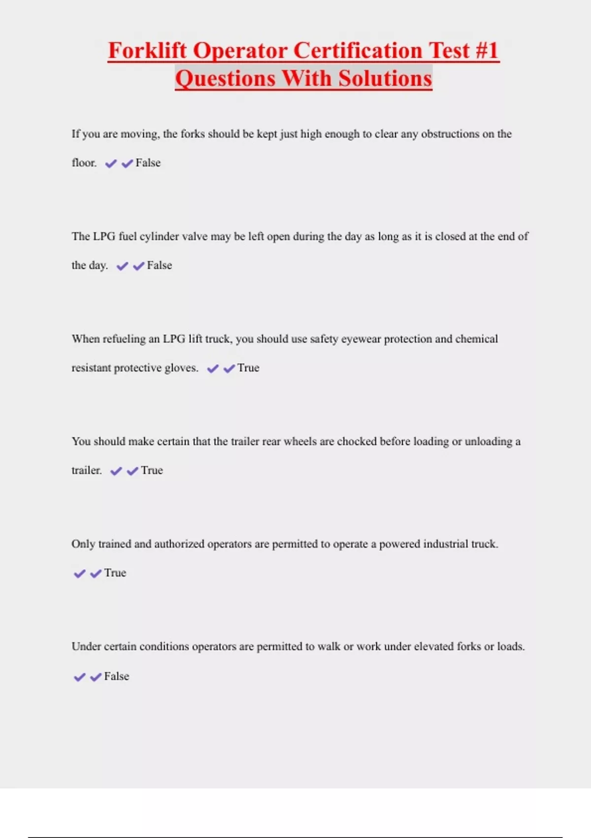 Forklift Operator Certification Test #1 Questions With Solutions If you are moving, the forks should be kept just high enough to clear any obstructions on the floor. False The LPG fuel cylinder valve may be left open during the day as long as it is closed at the end of the day. False When refueling an LPG lift truck, you should use safety eyewear protection and chemical resistant protective gloves. True You should make certain that the trailer rear wheels are chocked before loading or unloading a trailer. True
