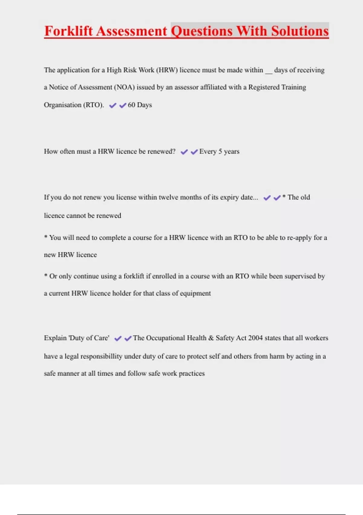 Forklift Assessment Questions With Solutions The application for a High Risk Work (HRW) licence must be made within __ days of receiving a Notice of Assessment (NOA) issued by an assessor affiliated with a Registered Training Organisation (RTO). 60 Days How often must a HRW licence be renewed? Every 5 years If you do not renew you license within twelve months of its expiry date... * The old licence cannot be renewed * You will need to complete a course for a HRW licence with an RTO to be able to re-apply for a new HRW licence * Or only continue using a forklift if enrolled in a course with an RTO while been supervised by a current HRW licence holder for that class of equipment