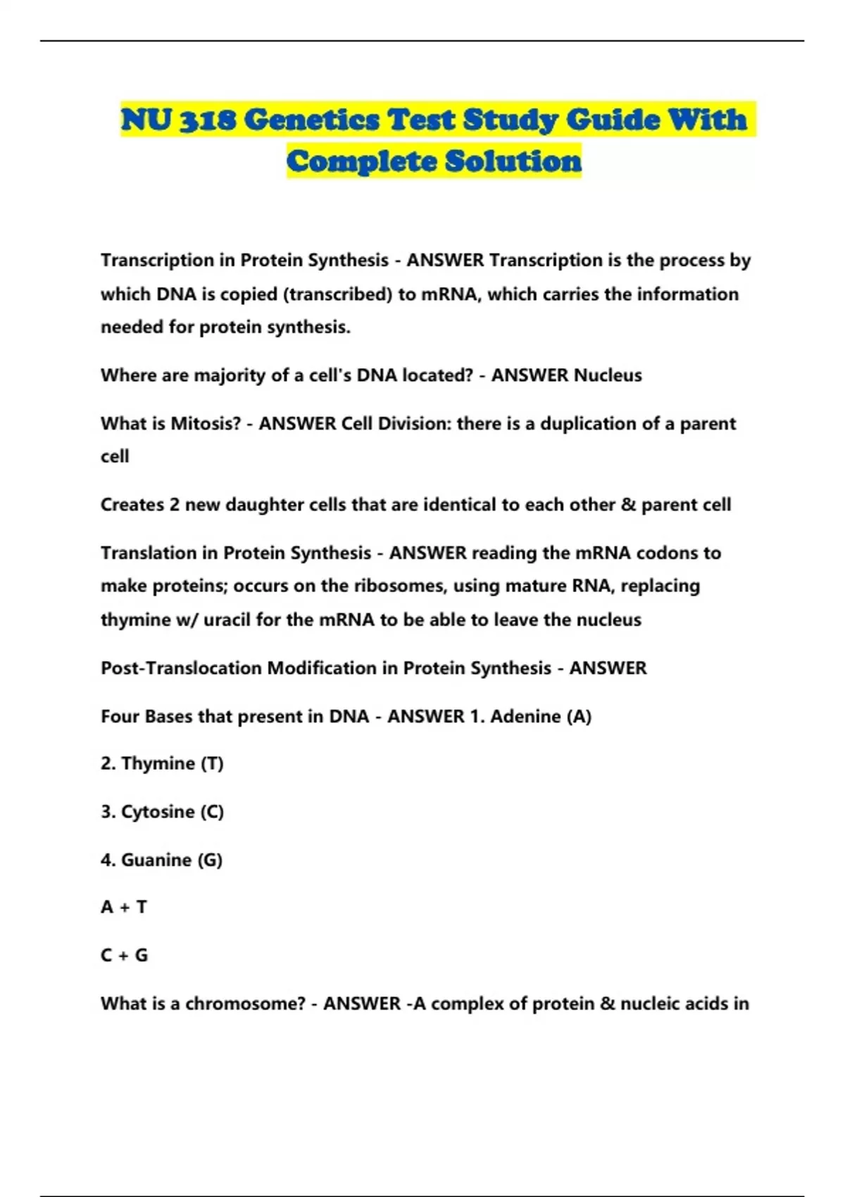 NU 318 Genetics Test Study Guide With Complete Solution...