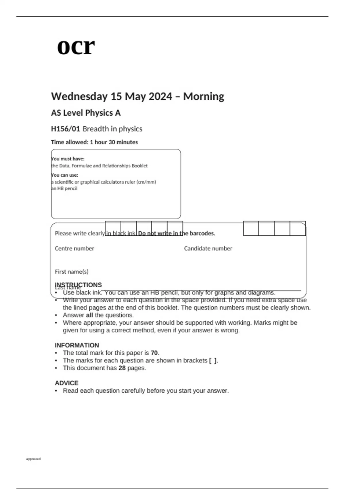 ocr AS Level Physics A (H156-01) Question Paper May2024.