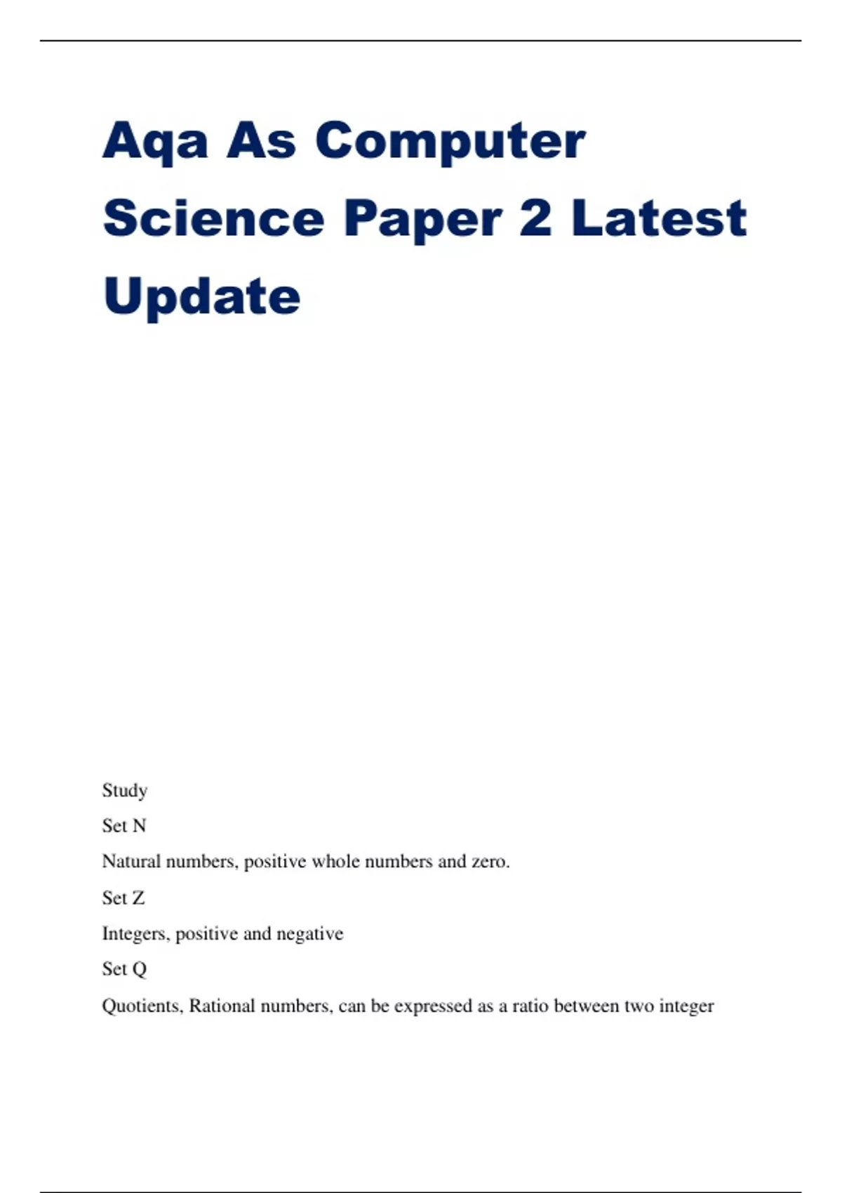 Aqa As Computer Science Paper 2 Latest Update Study Set N Natural numbers, positive whole numbers and zero. Set Z Integers, positive and negative Set Q Quotients, Rational numbers, can be expressed as a ratio between two integer Irrational numbers Cannot be expressed as a ratio between 2 numbers, root 2, pi Real numbers Set of irrational numbers, Q, Z, N Ordinal numbers Integers used to describe numerical position of objects. First, second, third Counting and measuring Natural numbers for counting, real numbers for measuring Decimal base 10, used by humans, subscript 10, also called denary, 0-9 Binary base 2, used by computers as they represent high or low voltage, 0 or 1, subscript 2 Hexadecimal base 16, used as shorthand representation for binary, 0-9 followed by A-F, subscript 16 Decimal Prefixes What is a bit Binary digit, can be 1 or 0 What is a byte 8 bits Name of 4 bits Nibble Notation of bit and byte? Bit is lower b, byte is upper B How many different values can be represented with n bits 2^n