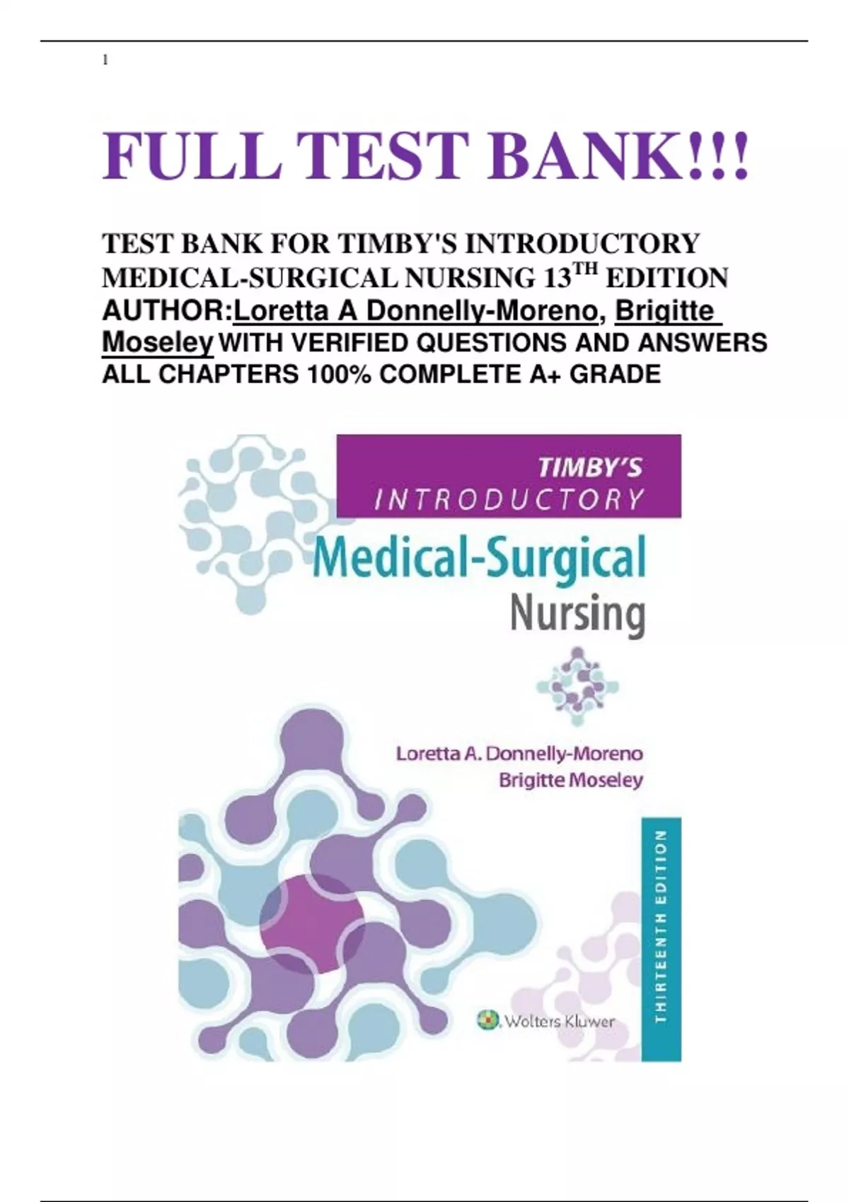 ◦ Timby's Introductory Medical-Surgical Nursing 13th Edition Moreno Test Bank