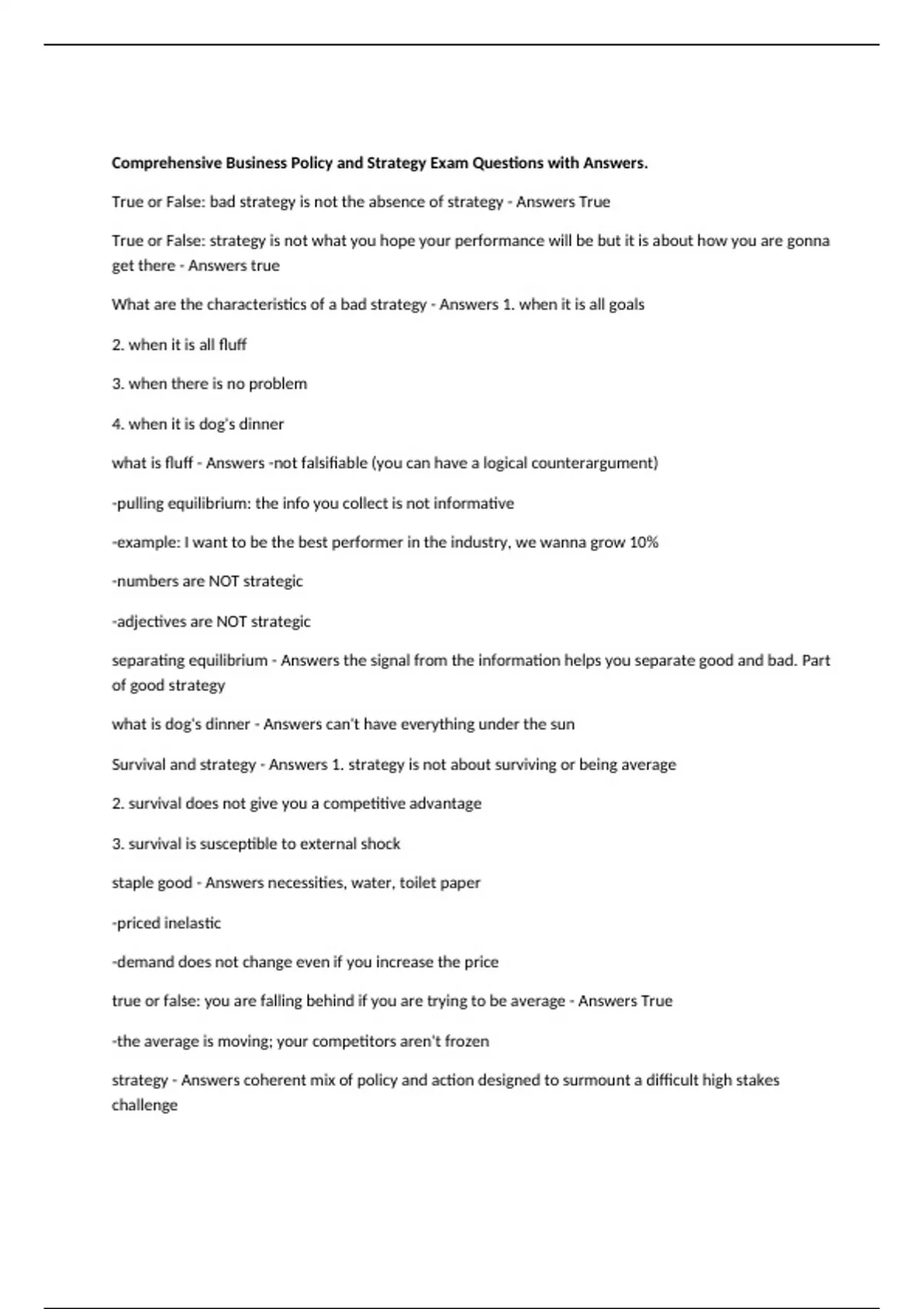 Comprehensive Business Policy and Strategy Exam Questions with Answers.