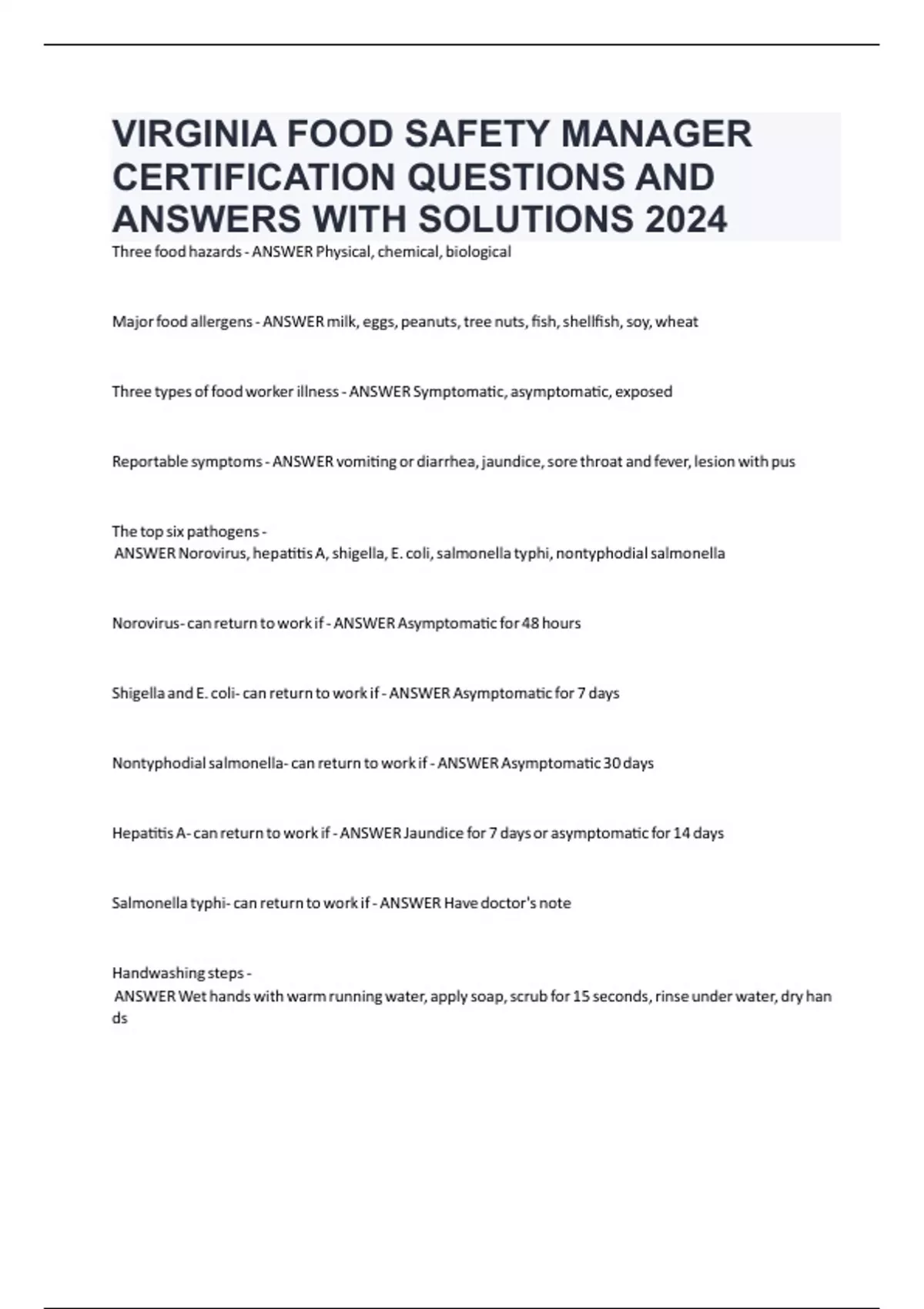 VIRGINIA FOOD SAFETY MANAGER CERTIFICATION QUESTIONS AND ANSWERS WITH SOLUTIONS 2024