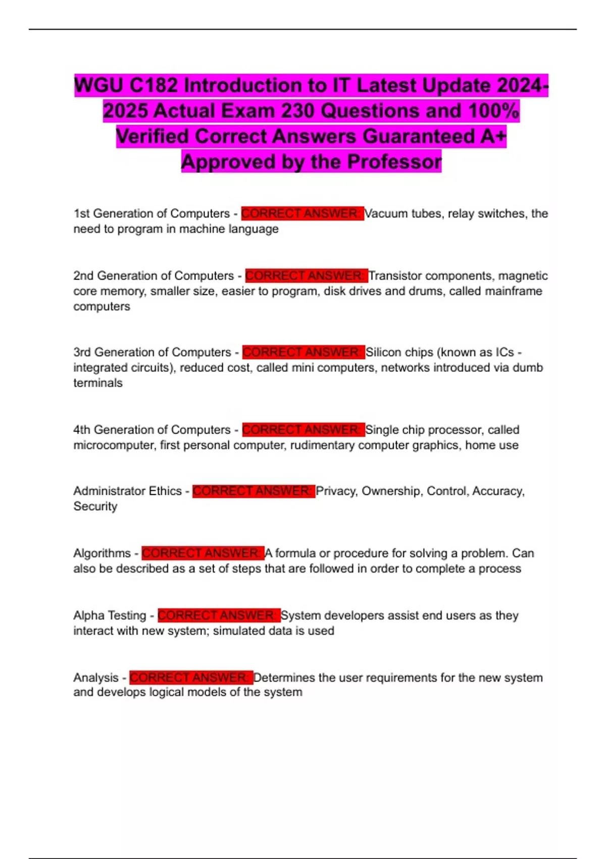 WGU C182 Introduction to IT Latest Update Actual Exam 230 Questions and 100% Verified Correct Answers Guaranteed A+ Approved by the Professor