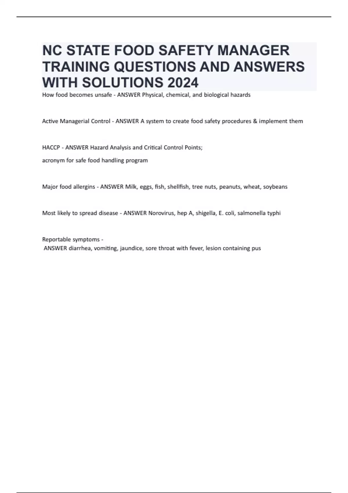 NC STATE FOOD SAFETY MANAGER TRAINING QUESTIONS AND ANSWERS WITH SOLUTIONS 2024