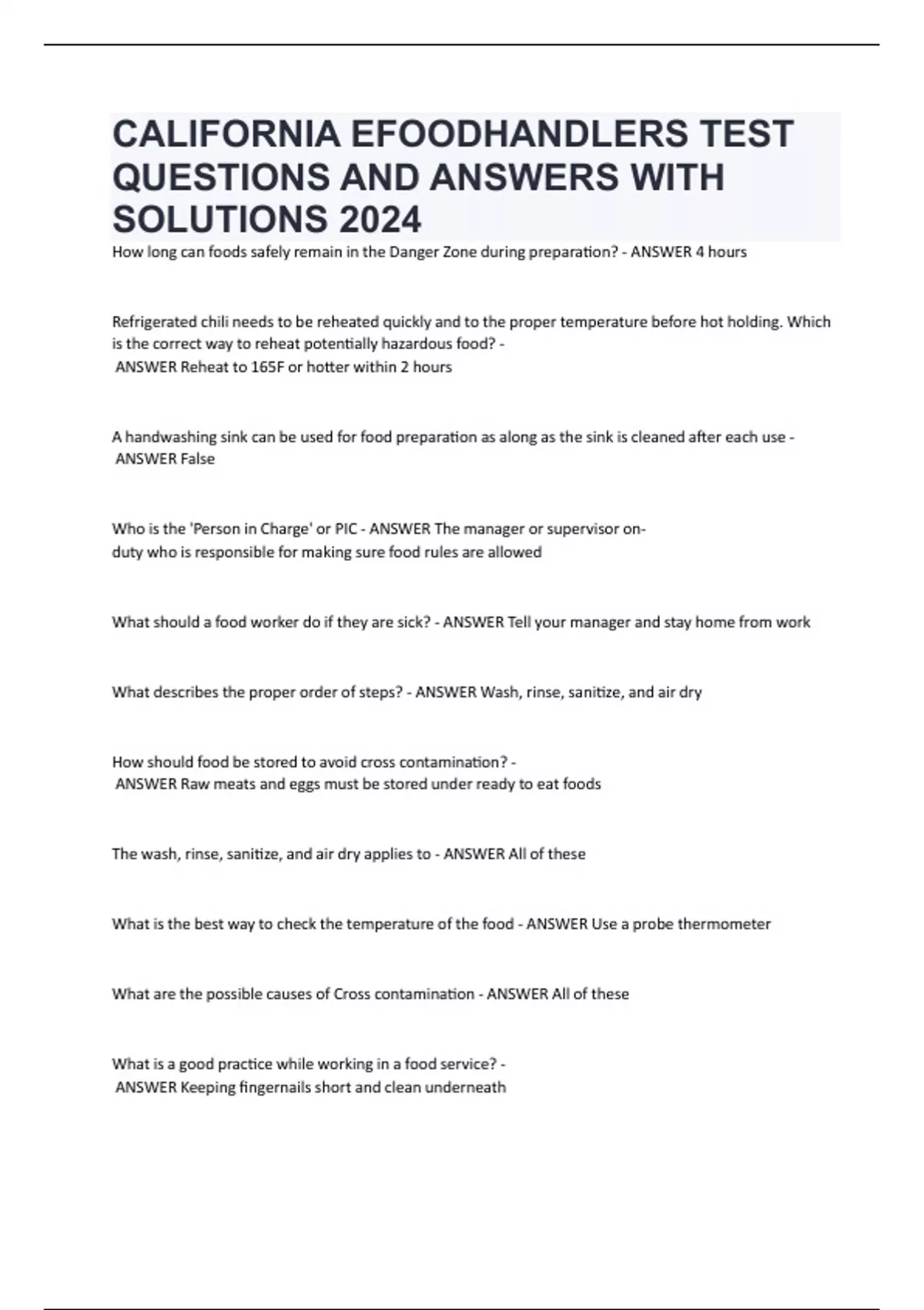 CALIFORNIA EFOODHANDLERS TEST QUESTIONS AND ANSWERS WITH SOLUTIONS 2024