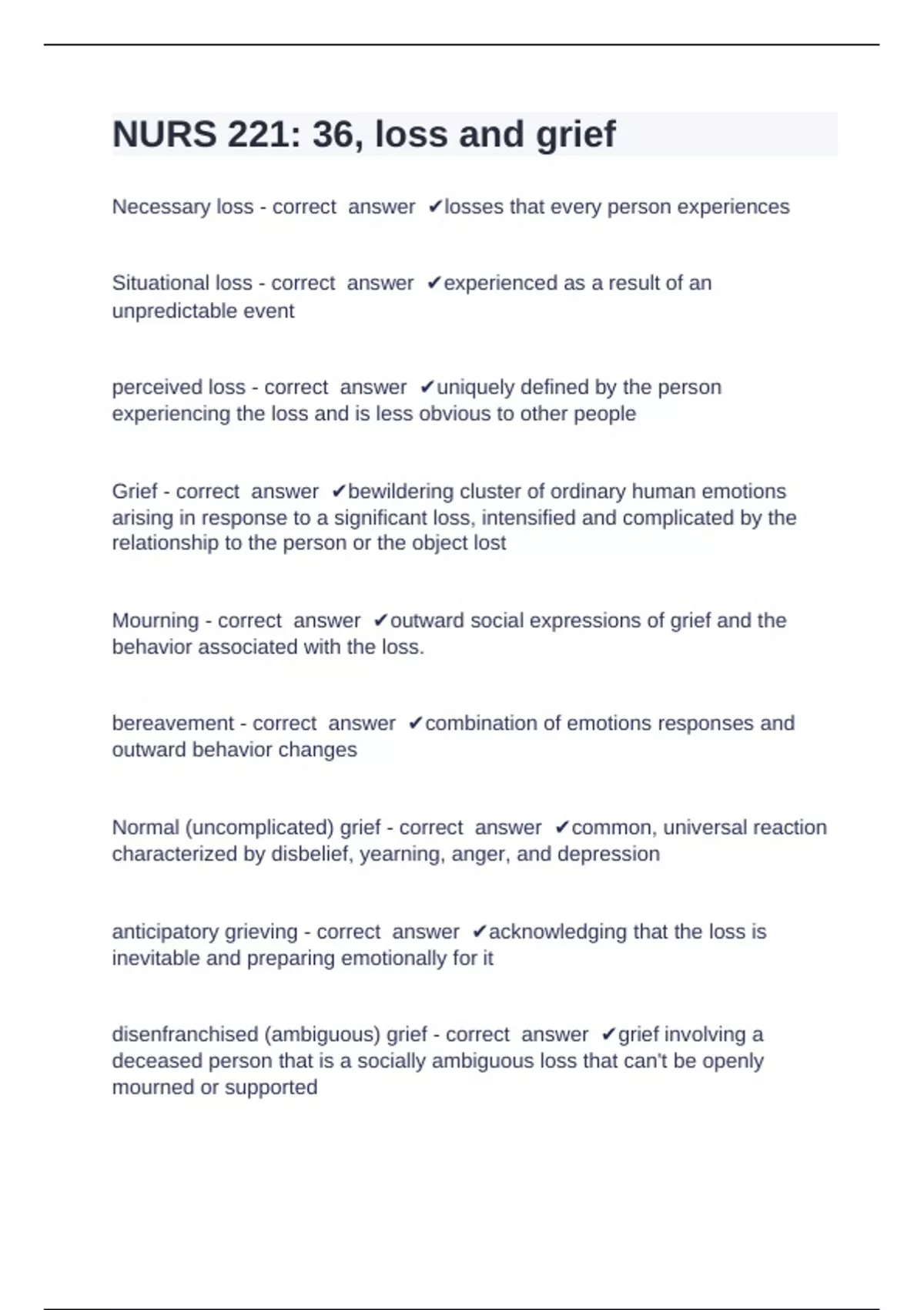 NURS 221 Liberty University - Questions with complete solution 2024/2025 NURS 221: 36, loss and grief Necessary loss - correct answer losses that every person experiences Situational loss - correct answer experienced as a result of an unpredictable event perceived loss - correct answer uniquely defined by the person experiencing the loss and is less obvious to other people Grief - correct answer bewildering cluster of ordinary human emotions arising in response to a significant loss, intensified and complicated by the relationship to the person or the object lost Mourning - correct answer outward social expressions of grief and the behavior associated with the loss. bereavement - correct answer combination of emotions responses and outward behavior changes Normal (uncomplicated) grief - correct answer common, universal reaction characterized by disbelief, yearning, anger, and depression anticipatory grieving - correct answer acknowledging that the loss is inevitable and preparing emotionally for it disenfranchised (am