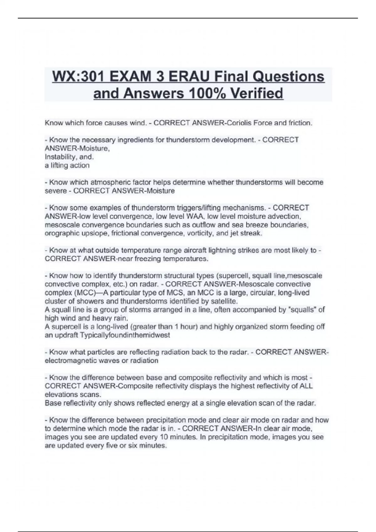 WX:301 EXAM 3 ERAU Final Questions and Answers 100% Verified Know which force causes wind. - CORRECT ANSWER-Coriolis Force and friction. - Know the necessary ingredients for thunderstorm development. - CORRECT ANSWER-Moisture, Instability, and. a lifting action - Know which atmospheric factor helps determine whether thunderstorms will become severe - CORRECT ANSWER-Moisture - Know some examples of thunderstorm triggers/lifting mechanisms. - CORRECT ANSWER-Iow level convergence, low level WAA, low level moisture advection, mesoscale convergence boundaries such as outflow and sea breeze boundaries, orographic upslope, frictional convergence, vorticity, and jet streak. - Know at what outside temperature range aircraft lightning strikes are most likely to CORRECT ANSWER-near freezing temperatures. - Know how to identify thunderstorm structural types (supercell, squall line,mesoscale convective complex, etc.) on radar. - CORRECT ANSWER-Mesoscale convective complex (MCC)—A particular type of MCS, an MCC is a large, circular, long-lived cluster of showers and thunderstorms identified by satellite. A squall line is a group of storms arranged in a line, often accompanied by "squalls" of high wind and heavy rain. A supercell is a long-lived (greater than I hour) and highly organized storm feeding off an updraft Typicallyfoundinthemidwest - Know what particles are reflecting radiation back to the radar. - CORRECT ANSWERelectromagnetic waves or radiation - Know the difference between base and composite reflectivity and which is most CORRECT ANSWER-Composite reflectivity displays the highest reflectivity of ALL elevations scans. Base reflectivity only shows reflected energy at a single elevation scan of the radar.