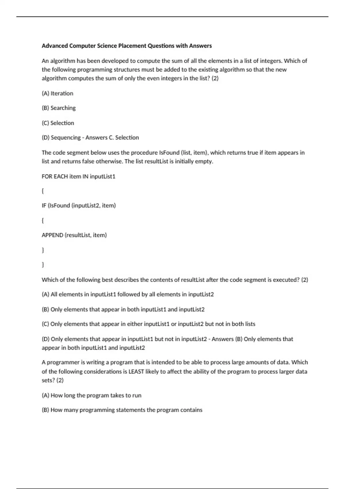 algorithm computes the sum of only the even integers in the list? (2)