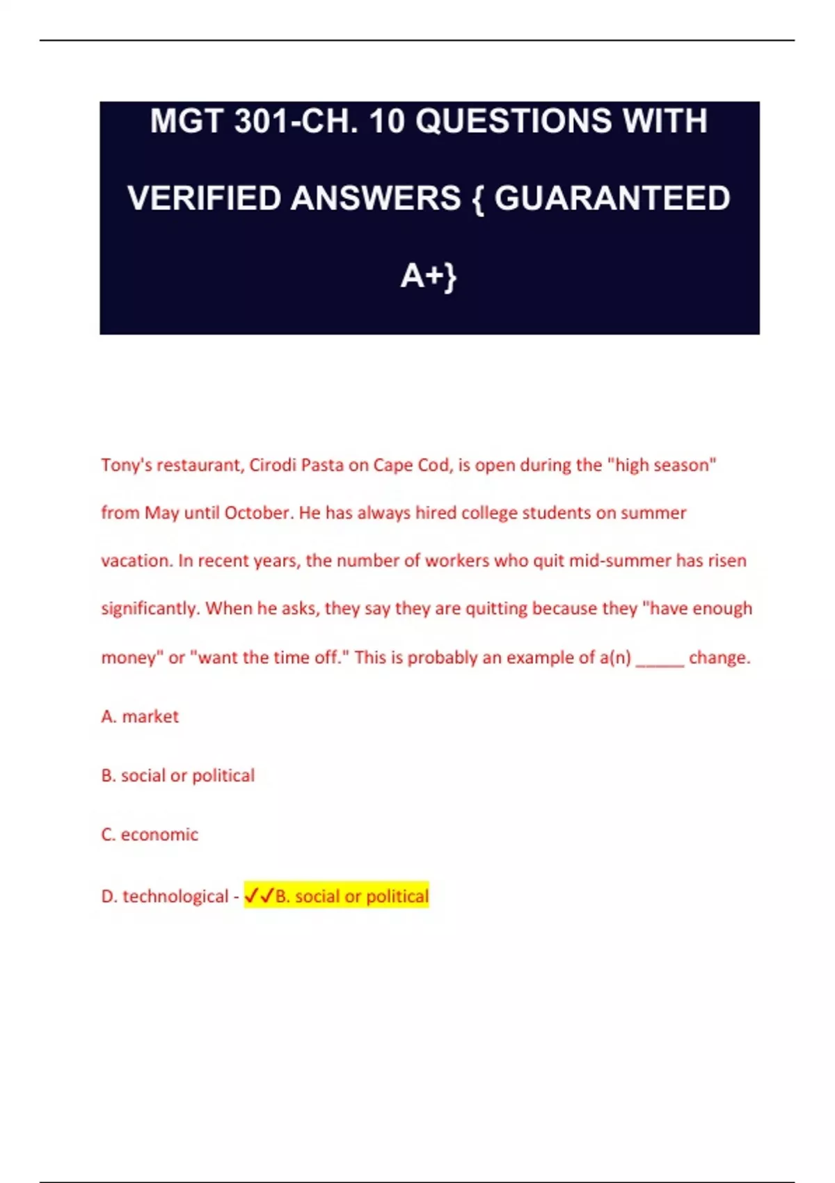 MGT 301-CH. 10 QUESTIONS WITH VERIFIED ANSWERS { GUARANTEED A+} Tony's restaurant, Cirodi Pasta on Cape Cod, is open during the "high season" from May until October. He has always hired college students on summer vacation. In recent years, the number of workers who quit mid-summer has risen significantly. When he asks, they say they are quitting because they "have enough money" or "want the time off." This is probably an example of a(n) _____ change. A. market B. social or political C. economic D. technological - B. social or political