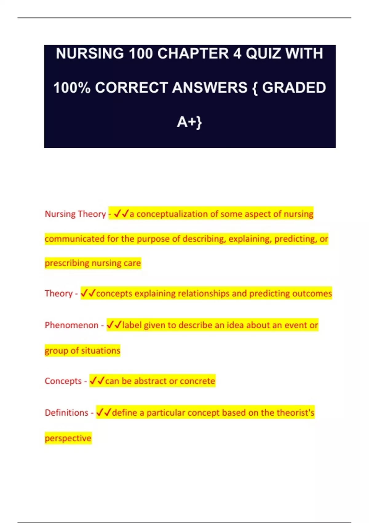 NURSING 100 CHAPTER 4 QUIZ WITH 100% CORRECT ANSWERS { GRADED A+} Nursing Theory - a conceptualization of some aspect of nursing communicated for the purpose of describing, explaining, predicting, or prescribing nursing care Theory - concepts explaining relationships and predicting outcomes Phenomenon - label given to describe an idea about an event or group of situations Concepts - can be abstract or concrete Definitions - define a particular concept based on the theorist's perspective