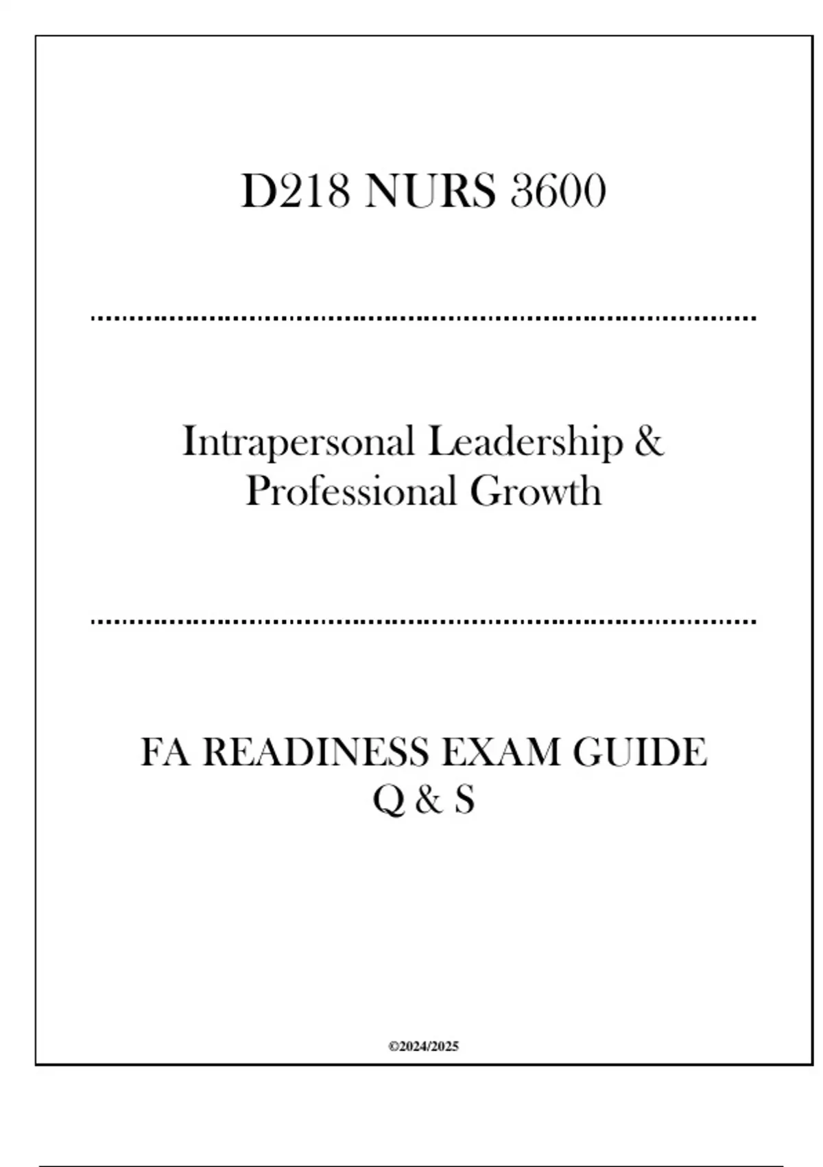 (WGU D218) NURS 3600 Intrapersonal Leadership& Professional Growth - FA Readiness Exam Guide(WGU D218) NURS 3600 Intrapersonal Leadership& Professional Growth - FA Readiness Exam Guide(WGU D218) NURS 3600 Intrapersonal Leadership& Professional Growth - FA Readiness Exam Guide(WGU D218) NURS 3600 Intrapersonal Leadership& Professional Growth - FA Readiness Exam Guide