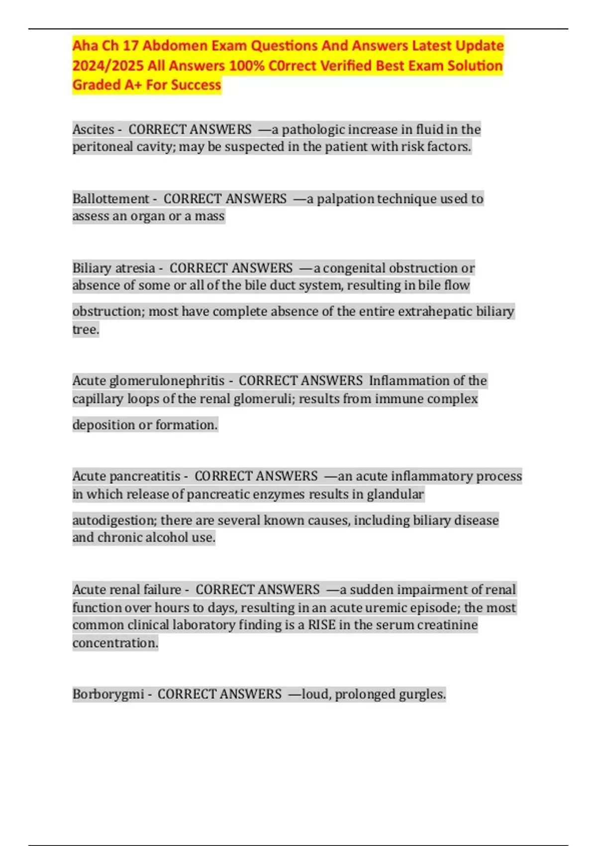 Aha Ch 17 Abdomen Exam Questions And Answers Latest Update 2024/2025 All Answers 100% C0rrect Verified Best Exam Solution Graded A+ For Success