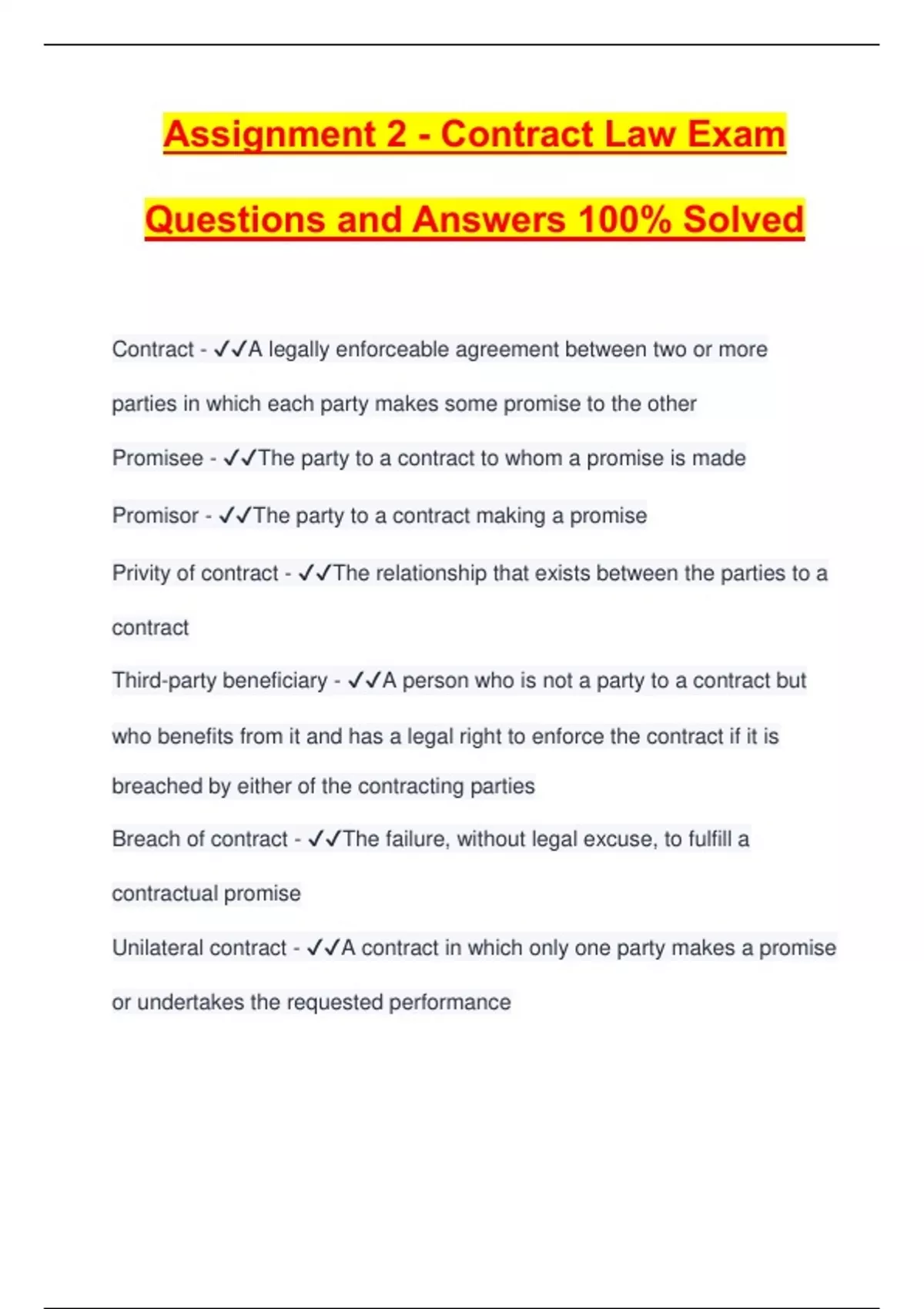 Contract - ✔✔A legally enforceable agreement between two or more