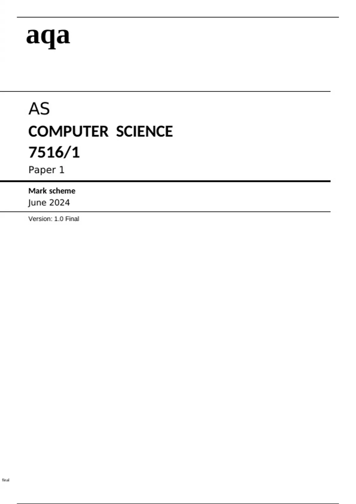 aqa AS COMPUTER SCIENCE (7516/1)Paper 1 MARK SCHEME June 2024