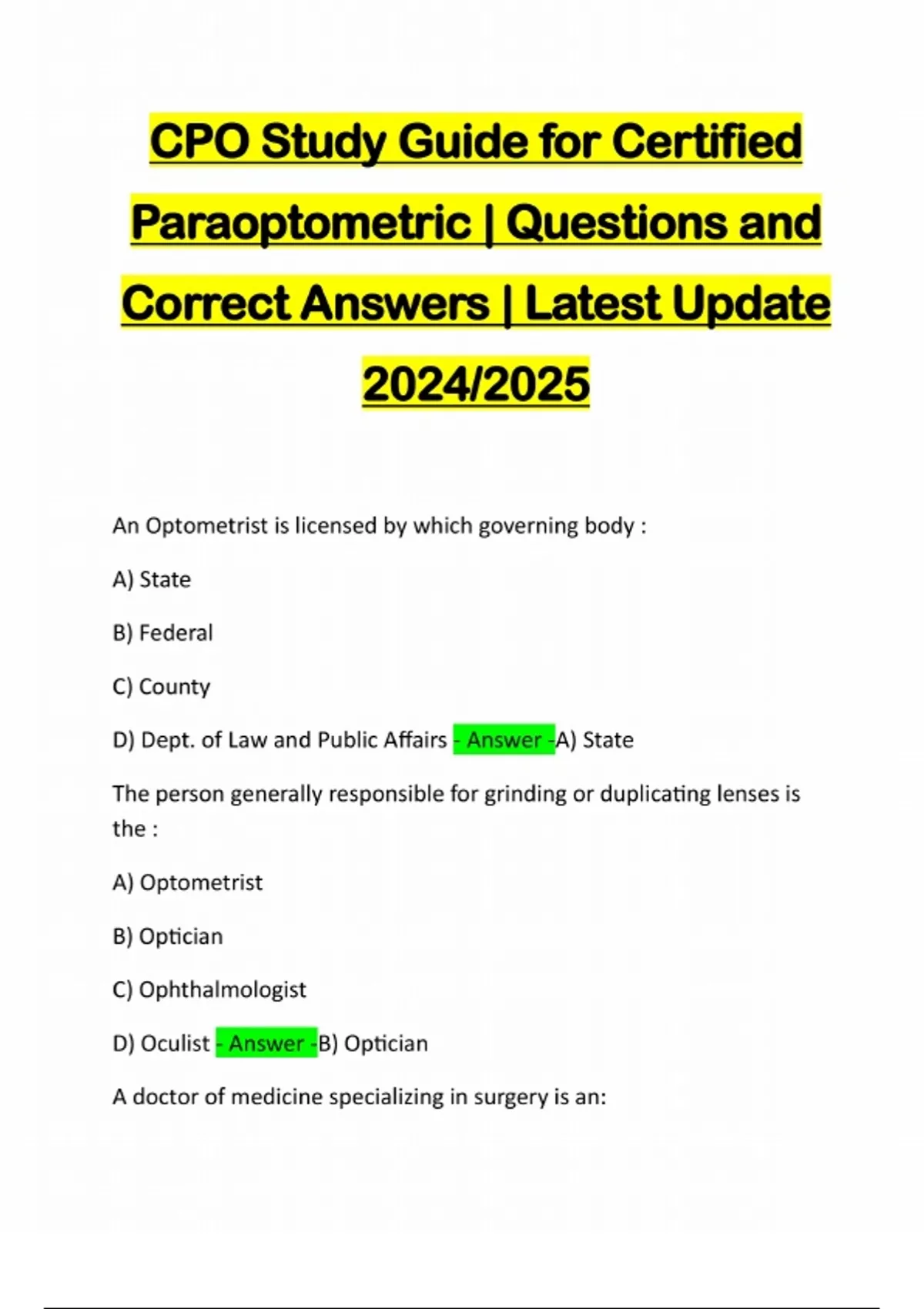 CPO Study Guide for Certified Paraoptometric | Questions and Correct Answers | Latest Update 2024/2025 An Optometrist is licensed by which governing body : A) State B) Federal C) County D) Dept. of Law and Public Affairs - Answer -A) State The person generally responsible for grinding or duplicating lenses is the : A) Optometrist B) Optician C) Ophthalmologist D) Oculist - Answer -B) Optician A doctor of medicine specializing in surgery is an:A) Optometrist B) Optician C) Ophthalmologist D) OMP - Answer -C) Ophthalmologist Ophthalmic Medical Personnel can do all BUT the following: A) Administer test B) Take eye measurements C) Take patient histories D) Offer medical diagnoses - Answer -D) Off