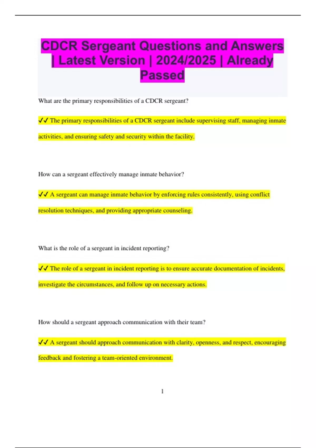CDCR Sergeant Questions and Answers | Latest Version | 2024/2025 | Already Passed What are the primary responsibilities of a CDCR sergeant? The primary responsibilities of a CDCR sergeant include supervising staff, managing inmate activities, and ensuring safety and security within the facility. How can a sergeant effectively manage inmate behavior? A sergeant can manage inmate behavior by enforcing rules consistently, using conflict resolution techniques, and providing appropriate counseling. What is the role of a sergeant in incident reporting? The role of a sergeant in incident reporting is to ensure accurate documentation of incidents, investigate the circumstances, and follow up on necessary actions. How should a sergeant approach communication with their team? A sergeant should approach communication with clarity, openness, and respect, encouraging feedback and fostering a team-oriented environment. 2 What is the importance of policies and procedures in a correctional setting? Policies and procedures are important in a correctional setting because they provide guidelines for staff actions, promote safety, and ensure consistent operations. How can a sergeant support the mental health needs of inmates? A sergeant can support mental health needs by identifying at-risk individuals, coordinating with mental health professionals, and facilitating access to resources. What strategies can be used to enhance safety in a correctional facility? Strategies to enhance safety include regular training for staff, conducting drills, and implementing surveillance systems to monitor activities. How does a sergeant play a role in conflict resolution among staff? A sergeant plays a role in conflict resolution by mediating disputes, promoting open communication, and encouraging teamwork among staff members. What are the key elements of effective leadership in corrections? Key elements of effective leadership in corrections include integrity, decisiveness, empathy, and the ability to inspire and motivate staff. 3 What is the purpose of performance evaluations for correctional officers? The purpose of performance evaluations is to assess officers' job performance, provide feedback, and identify areas for professional development. How can a sergeant promote rehabilitation