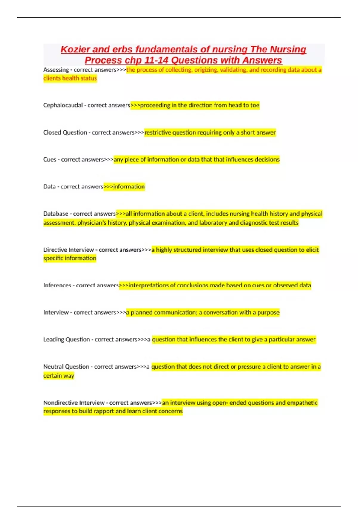 Kozier and erbs fundamentals of nursing The Nursing Process chp 11-14 Questions with Answers Assessing - correct answers>>>the process of collecting, origizing, validating, and recording data about a clients health status Cephalocaudal - correct answers>>>proceeding in the direction from head to toe Closed Question - correct answers>>>restrictive question requiring only a short answer Cues - correct answers>>>any piece of information or data that that influences decisions Data - correct answers>>>information Database - correct answers>>>all information about a client, includes nursing health history and physical assessment, physician's history, physical examination, and laboratory and diagnostic test results Directive Interview - correct answers>>>a highly structured interview that uses closed question to elicit specific information Inferences - correct answers>>>interpretations of conclusions made based on cues or observed data Interview - correct answers>>>a planned communication; a conversation with a purpose Leading Question - correct answers>>>a question that influences the client to give a particular answer Neutral Question - correct answers>>>a question that does not direct or pressure a client to answer in a certain way Nondirective Interview - correct answers>>>an interview using open- ended questions and empathetic responses to build rapport and learn client concerns