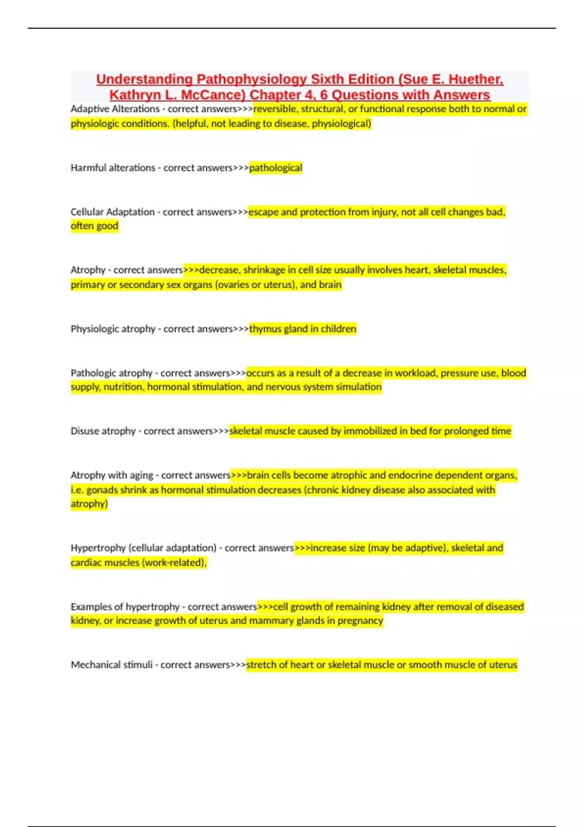 Understanding Pathophysiology Sixth Edition (Sue E. Huether, Kathryn L. McCance) Chapter 4, 6 Questions with Answers Adaptive Alterations - correct answers>>>reversible, structural, or functional response both to normal or physiologic conditions. (helpful, not leading to disease, physiological) Harmful alterations - correct answers>>>pathological Cellular Adaptation - correct answers>>>escape and protection from injury, not all cell changes bad, often good Atrophy - correct answers>>>decrease, shrinkage in cell size usually involves heart, skeletal muscles, primary or secondary sex organs (ovaries or uterus), and brain Physiologic atrophy - correct answers>>>thymus gland in children Pathologic atrophy - correct answers>>>occurs as a result of a decrease in workload, pressure use, blood supply, nutrition, hormonal stimulation, and nervous system simulation Disuse atrophy - correct answers>>>skeletal muscle caused by immobilized in bed for prolonged time Atrophy with aging - correct answers>>>brain cells become atrophic and endocrine dependent organs, i.e. gonads shrink as hormonal stimulation decreases (chronic kidney disease also associated with atrophy) Hypertrophy (cellular adaptation) - correct answers>>>increase size (may be adaptive), skeletal and cardiac muscles (work-related), Examples of hypertrophy - correct answers>>>cell growth of remaining kidney after removal of diseased kidney, or increase growth of uterus and mammary glands in pregnancy Mechanical stimuli - correct answers>>>stretch of heart or skeletal muscle or smooth muscle of uterus