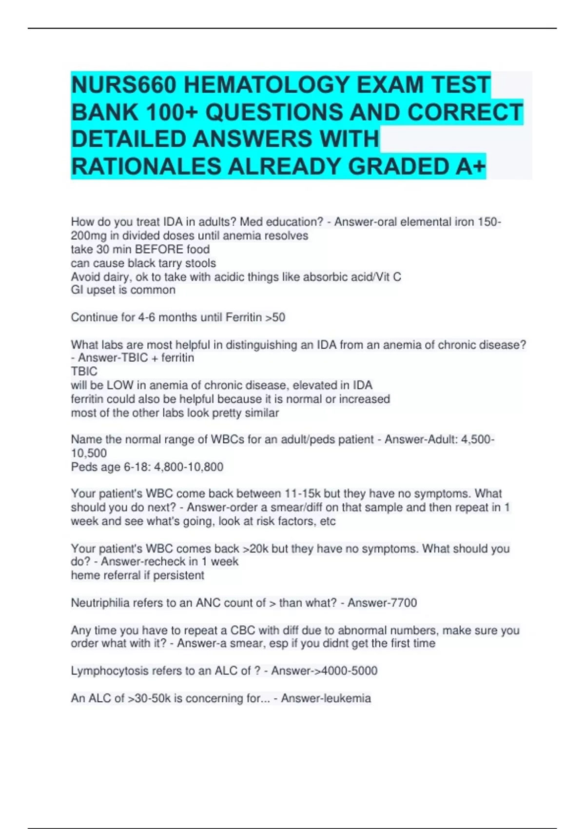 How do you treat IDA in adults? Med education? - Answer-oral elemental iron 150-