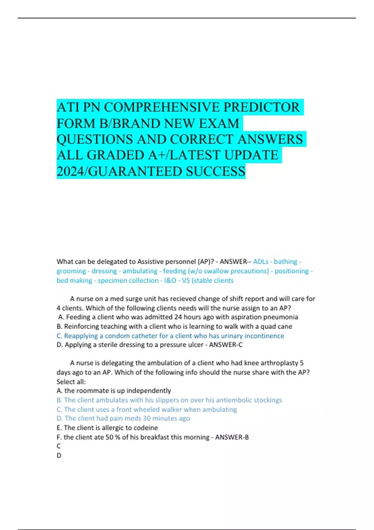ATI PN COMPREHENSIVE PREDICTOR FORM A/LATEST UPDATE 2024/BRAND NEW VERIFIED EXAM QUESTIONS WITH CORRECT ANSWERS/ALL GRADED A+ . If a client develops cor pulmonale (right-sided heart failure), the nurse would expect to observe 1. increasing respiratory difficulty seen with exertion. 2. cough productive of a large amount of thick, yellow mucus. 3. peripheral edema and anorexia. 4. twitching of extremities. - ANSWER-3 . The nursing team includes two RNs, one LPN/LVN, and one nursing assistant. The nurse should consider the assignments appropriate if the nursing assistant is assigned to care for 1. a client with Alzheimer's requiring assistance with feeding. 2. a client with osteoporosis complaining of burning on urination. 3. a client with scleroderma receiving a tube feeding. 4. a client with cancer who has Cheyne-Stokes respirations. - ANSWER-1 A 23-year-old man is admitted with a subdural hematoma and cerebral edema after a motorcycle accident. Which of the following symptoms should the nurse expect to see INITIALLY? 1. Unequal and dilated pupils. 2. Decerebrate posturing. 3. Grand mal seizures. 4. Decreased level of consciousness. - ANSWER-4 A 23-year-old woman at 32-weeks gestation is seen in the outpatient clinic. Which of the following findings, if assessed by the nurse, would indicate a possible complication? 1. The client's urine test is positive for glucose and acetone. 2. The client has 1+ pedal edema in both feet at the end of the day. 3. The client complains of an increase in vaginal discharge. 4. The client says she feels pressure against her diaphragm when the baby moves. - ANSWER-1 A 38-year-old woman is returned to her room after a subtotal thyroidectomy for treatment of hyperthyroidism. Which of the following, if found by the nurse at the patient's bedside, is nonessential? 1. Potassium chloride for IV administration. 2. Calcium gluconate for IV administration. 3. Tracheostomy set-up. 4. Suction equipment. - ANSWER-1 A 59-year-old woman with bipolar disorder is receiving haloperidol (Haldol) 2 mg PO tid. She tells the nurse, "Milk is coming out of my breasts." Which of the following responses by the nurse is BEST? 1. "You are seeing things that aren't real." 2. "Why don't we go make some fudge." 3. "You are experiencing a side effect of Haldol." 4. "I'll contact your physician to change your medication." - ANSWER-3 A 69-year-old client is undergoing his second exchange of intermittent peritoneal dialysis (IPD). Which of the following would require an intervention by the nurse? 1. The client complains of pain during the inflow of the dialysate. 2. The client complains of constipation. 3. The dialysate outflow is cloudy. 4. There is blood-tinged fluid around the intra-abdominal catheter. - ANSWER-3 A charge nurse is discussing the responsibility of nurses carig for clients who have C. difficile. Which of the following information should the nurse include in the teaching? a) Assign the client to a room with a negative air-flow system b) Use alcohol-based hand sanitizer when leaving the clients room c) clean contaminated surfaces in the clients room with a phenol solution d) have family members wear a gown and gloves when visiting - ANSWER-D A client diagnosed with dementia wanders the halls of the locked nursing unit during the day. To ensure the client's safety while walking in the halls, the nurse should do which of the following? 1. Administer PRN haloperidol (Haldol) to decrease the need to walk. 2. Assess the client's gait for steadiness. 3. Restrain the client in a geriatric chair. 4. Administer PRN lorazepam (Ativan) to provide sedation. - ANSWER-2 A client has a history of oliguria, hypertension, and peripheral edema. Current lab values are: BUN -25, K+ -4.0 mEq/L. Which nutrient should be restricted in the client's diet? 1. Protein. 2. Fats. 3. Carbohydrates. 4. Magnesium. - ANSWER-1 a client has a new prescription for spironilactone ( aldactone ) which of the following laboratory value should the nurse recognized as a reason to withhold the morning dose of the medication and notify the provider - ANSWER-serum potassium 5.2 a client has prescription for valproic ( Depakote) which of the following laboratory value should the nurse anticipate monitor for the client taking this medication - ANSWER-thrombocytes, amylase count and liver function test A client is admitted with a diagnosis of acute appendicitis. When assessing the abdomen, the nurse would expect to find rebound tenderness at which location? a) Left lower quadrant b) Left upper quadrant c) Right upper quadrant d) Right lower quadrant - ANSWER-D A client is being discharged with sublingual nitroglycerin (Nitrostat). The client should be cautioned by the nurse to 1. take the medication five minutes after the pain has started. 2. stop taking the medication if a stinging sensation is absent. 3. take the medication on an empty stomach. 4. avoid abrupt changes in posture. - ANSWER-4 A client is given morphine 6 mg IV push for postoperative pain. Following administration of this drug, the nurse observes the following: pulse 68, respirations 8, BP 100/68, client sleeping quietly. Which of the following nursing actions is MOST appropriate? 1. Allow the client to sleep undisturbed. 2. Administer oxygen via facemask or nasal prongs. 3. Administer naloxone (Narcan). 4. Place epinephrine 1:1,000 at the bedside. - ANSWER-3 A client is receiving total parenteral nutrition (TPN). To determine the client's tolerance of this treatment, the nurse should assess for which of the following? 1. A significant increase in pulse rate. 2. A decrease in diastolic blood pressure. 3. Temperature in excess of 98.6°F (37°C). 4. Urine output of at least 30 cc per hour. - ANSWER-4 A client is scheduled for a left lower lobectomy. The physician has ordered diazepam (Valium) 2 mg IM for anxiety. The nurse would determine that the medication is appropriate if the client displays which of the following symptoms? 1. Agitation and decreased leve