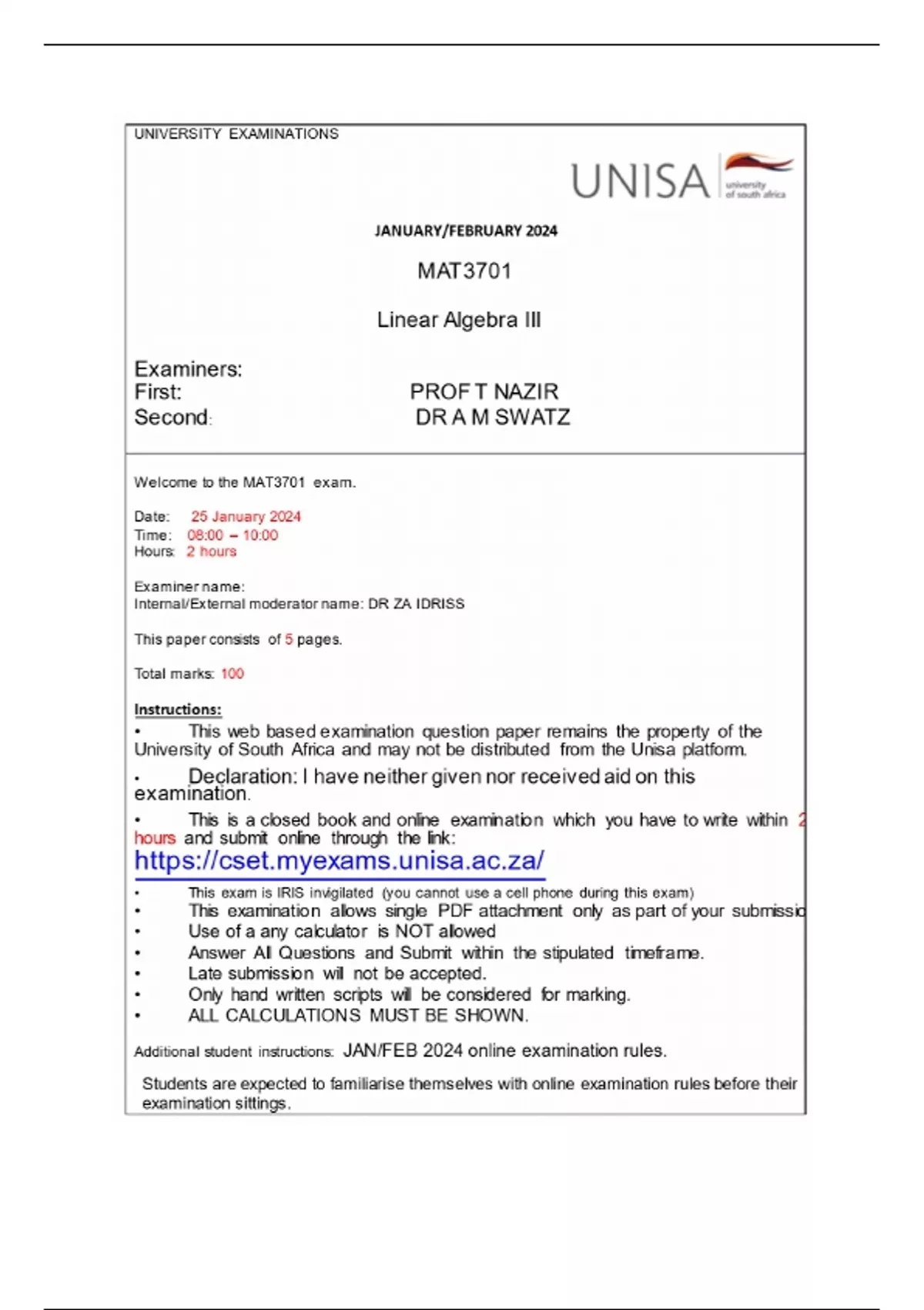 Exam (elaborations) Linear Algebra III (MAT3701) - JAN/FEB 2024