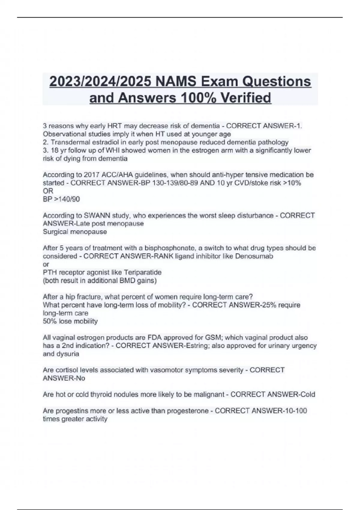2023/2024/2025 NAMS Exam Questions and Answers 100% Verified 3 reasons why early HRT may decrease risk of dementia - CORRECT ANSWER-I . Observational studies imply it when HT used at younger age 2. Transdermal estradiol in early post menopause reduced dementia pathology 3. 18 yr follow up of WHI showed women in the estrogen arm with a significantly lower risk of dying from dementia According to 2017 ACC/AHA guidelines, when should anti-hyper tensive medication be started - CORRECT ANSWER-BP 130-139/80-89 AND 10 yr CVD/stoke risk OR BP >140/90 According to SWANN study, who experiences the worst sleep disturbance - CORRECT ANSWER-Late post menopause Surgical menopause After 5 years of treatment with a bisphosphonate, a switch to what drug types should be considered - CORRECT ANSWER-RANK ligand inhibitor like Denosumab or PTH receptor agonist like Teriparatide (both result in additional BMD gains) After a hip fracture, what percent of women require long-term care? What percent have long-term loss of mobility? - CORRECT ANSWER-25% require long-term care 50% lose mobility All vaginal estrogen products are FDA approved for GSM; which vaginal product also has a 2nd indication? - CORRECT ANSWER-Estring; also approved for urinary urgency and dysuria Are cortisol levels associated with vasomotor symptoms severity - CORRECT ANSWER-No Are hot or cold thyroid nodules more likely to be malignant - CORRECT ANSWER-Cold Are progestins more or less active than progesterone - CORRECT ANSWER-10-100 times greater activity Are statins effective at reducing CV mortality when used for primary prevention CORRECT ANSWER-Most effective at reducing CV mortality if ASCVD risk is greater than 10%