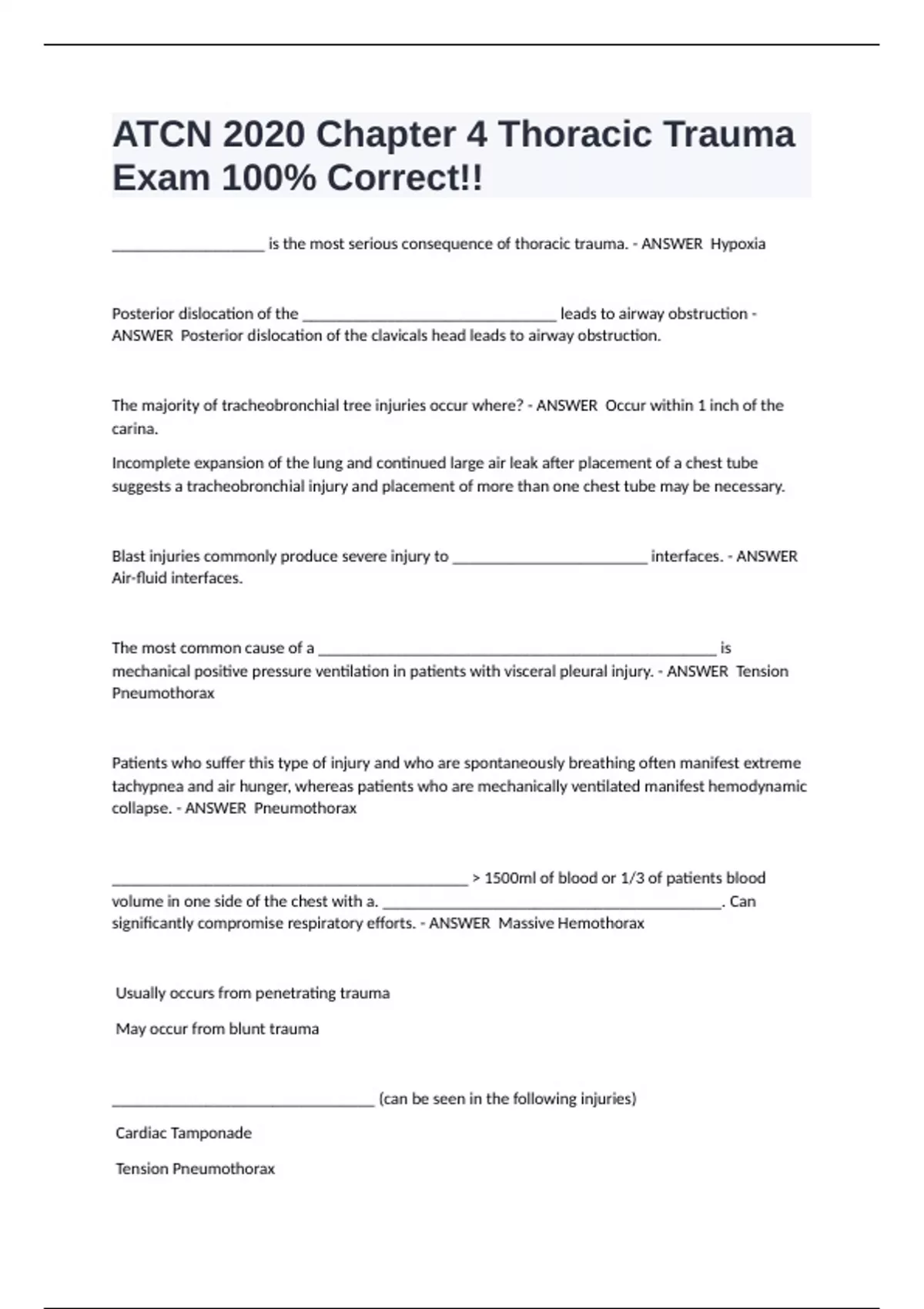 __________________ is the most serious consequence of thoracic trauma. - ANSWER Hypoxia Posterior dislocation of the ______________________________ leads to airway obstruction - ANSWER Posterior dislocation of the clavicals head leads to airway obstruction. The majority of tracheobronchial tree injuries occur where? - ANSWER Occur within 1 inch of the carina. Incomplete expansion of the lung and continued large air leak after placement of a chest tube suggests a tracheobronchial injury and placement of more than one chest tube may be necessary. Blast injuries commonly produce severe injury to _______________________ interfaces. - ANSWER Air-fluid interfaces. The most common cause of a _______________________________________________ is mechanical positive pressure ventilation in patients with visceral pleural injury. - ANSWER Tension Pneumothorax Patients who suffer this type of injury and who are spontaneously breathing often manifest extreme tachypnea and air hunger, whereas patients who are mechanically ventilated manifest hemodynamic collapse. - ANSWER Pneumothorax __________________________________________ > 1500ml of blood or 1/3 of patients blood volume in one side of the chest with a. ________________________________________. Can significantly compromise respiratory efforts. - ANSWER Massive Hemothorax