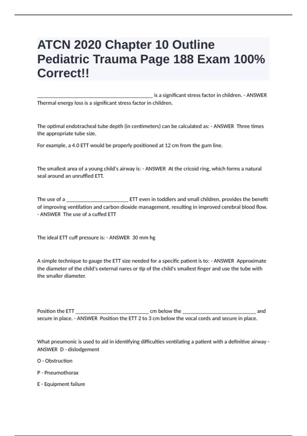 _________________________________________ is a significant stress factor in children. - ANSWER Thermal energy loss is a significant stress factor in children. The optimal endotracheal tube depth (in centimeters) can be calculated as: - ANSWER Three times the appropriate tube size. For example, a 4.0 ETT would be properly positioned at 12 cm from the gum line. The smallest area of a young child's airway is: - ANSWER At the cricoid ring, which forms a natural seal around an unruffled ETT. The use of a ______________________ ETT even in toddlers and small children, provides the benefit of improving ventilation and carbon dioxide management, resulting in improved cerebral blood flow. - ANSWER The use of a cuffed ETT The ideal ETT cuff pressure is: - ANSWER 30 mm hg A simple technique to gauge the ETT size needed for a specific patient is to: - ANSWER Approximate the diameter of the child's external nares or tip of the child's smallest finger and use the tube with the smaller diameter.