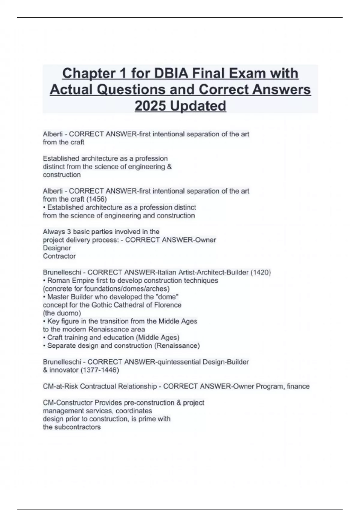 Chapter 1 for DBIA Final Exam with Actual Questions and Correct Answers 2025 Updated Alberti - CORRECT ANSWER-first intentional separation of the art from the craft Established architecture as a profession distinct from the science of engineering & construction Alberti - CORRECT ANSWER-first intentional separation of the art from the craft (1456) • Established architecture as a profession distinct from the science of engineering and construction Always 3 basic parties involved in the project delivery process: - CORRECT ANSWER-Owner Designer Contractor Brunelleschi - CORRECT ANSWER-Italian Artist-Architect-BuiIder (1420) • Roman Empire first to develop construction techniques (concrete for foundations/domes/arches) • Master Builder who developed the "dome" concept for the Gothic Cathedral of Florence (the duomo) • Key figure in the transition from the Middle Ages to the modern Renaissance area • Craft training and education (Middle Ages) • Separate design and construction (Renaissance) Bruneileschi - CORRECT ANSWER-quintessential Design-Builder & innovator () CM-at-Risk Contractual Relationship - CORRECT ANSWER-Owner Program, finance CM-Constructor Provides pre-construction & project management services, coordinates design