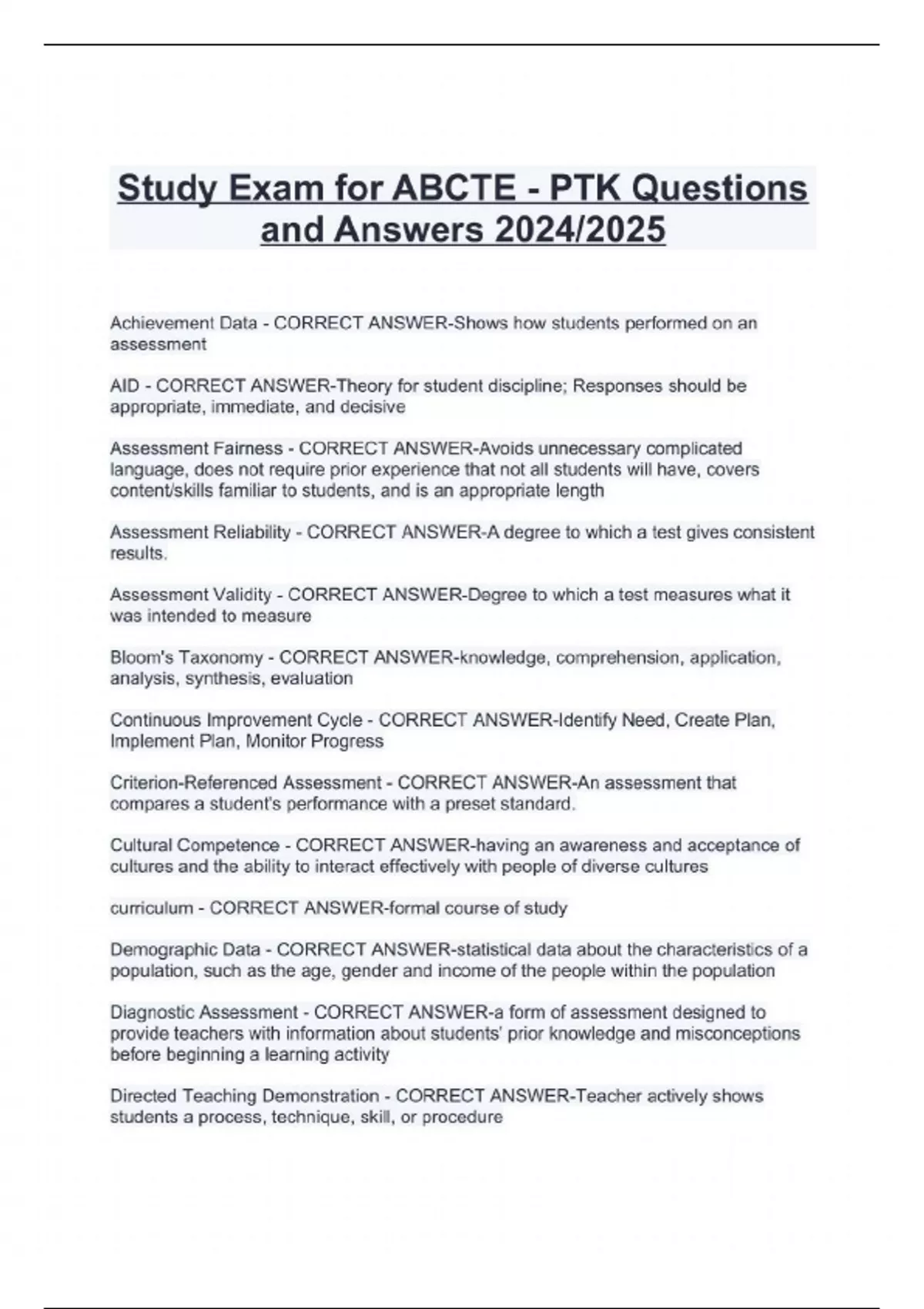 study Exam for ABCTE - PTK Questions and Answers 2024/2025 Achievement Data - CORRECT ANSWER-Shows how students performed on an assessment AID - CORRECT ANSWER-Theory for student discipline; Responses should be appropriate, immediate, and decisive Assessment Fairness - CORRECT ANSWER-Avoids unnecessary complicated language, does not require prior experience that not all students will have, covers content/skills familiar to students, and is an appropriate length Assessment Reliability - CORRECT ANSWER-A degree to which a test gives consistent results. Assessment Validity - CORRECT ANSWER-Degree to which a test measures what it was intended to measure Bloom's Taxonomy - CORRECT ANSWER-knowledge, comprehension, application, analysis, synthesis, evaluation Continuous Improvement Cycle - CORRECT ANSWER-Identify Need, Create Plan, Implement Plan, Monitor Progress
