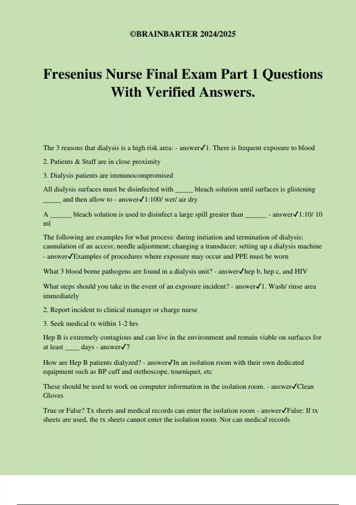 Fresenius Nurse Final Exam Part 1 Questions With Verified Answers.
