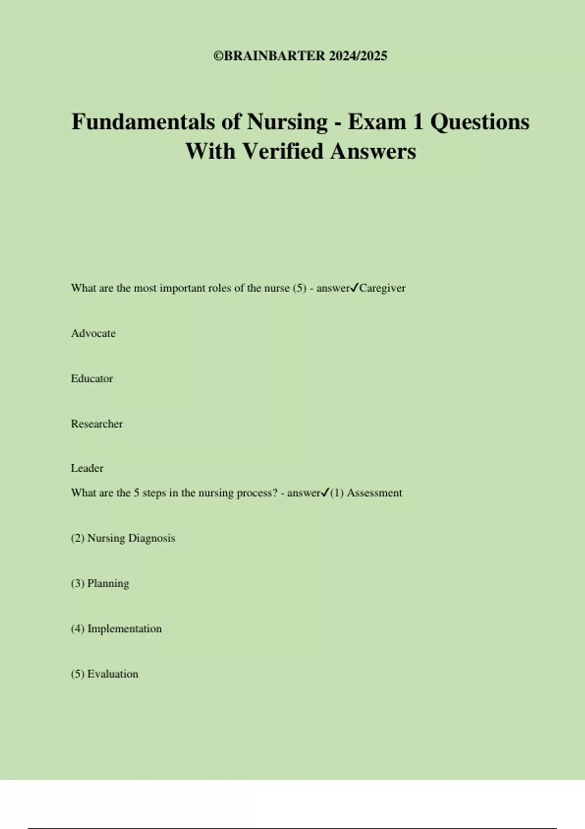 ©BRAINBARTER 2024/2025 Fundamentals of nursing Exam 1 Questions With Verified Answers The nurse is preparing a client to be turned in bed. In what position would the nurse place the client to begin this procedure? lying flat sitting up lying flat with feet raised slightly lying prone - answerlying flat The nurse and an assistant are preparing to move a client up in bed. Arrange the following steps in the correct order. 1. Adjust the head of the bed to a flat position. 2. Place a friction-reducing sheet under the client. 3. Ask the client to bend legs and place the chin on the chest. 4. Position the assistant on the side opposite you. 5. Remove all pillows from under the client. 6. Grasp the sheet and move the client on the count of 3. ©BRAINBARTER 2024/2025 A) 3, 1, 2, 4, 5, 6 B) 1, 2, 4, 3, 5, 6 C) 1, 5, 4, 2, 3, 6 D) 3, 2, 1, 4, 6, 5 E) 1, 3, 2, 4, 5, 6 - answerAns: C What nursing organization first legitimized the use of the nursing process? A) National League for Nursing ©BRAINBARTER 2024/2025 B) American Nurses Association C) International Council of Nursing D) State Board of Nursing - answerB) American Nurses Association A female patient who is receiving chemotherapy for breast cancer tells the nurse, "The treatment for this cancer is worse than the disease itself. I'm not going to come for my therapy anymore." The nurse responds by using critical thinking skills to address this patient problem. Which action is the first step the nurse would take in this process? a. The nurse judges whether the patient database is adequate to address the problem. b. The nurse considers whether or not to suggest a counseling session for the patient. c. The nurse reassesses the patient and decides how best to intervene in her care. d. The nurse identifies several options for intervening in the patient's care and critiques the merit of each option. - answerc. The first step when thinking critically about a situation is to identify the purpose or goal of your thinking. Reassessing the patient helps to discipline thinking by directing all thoughts toward the goal. Once the problem is addressed, it is important for the nurse to judge the adequacy of the knowledge, identify potential problems, use helpful resources, and critique the decision. The nursing process ensures that nurses are person centered rather than task centered. Rather than simply approaching a patient to take vital signs, the nurse thinks, "How is Mrs. Barclay today? Are our nursing actions helping her to achieve her goals? How can we better help her?" This demonstrates which characteristic of the nursing process? a. Systematic