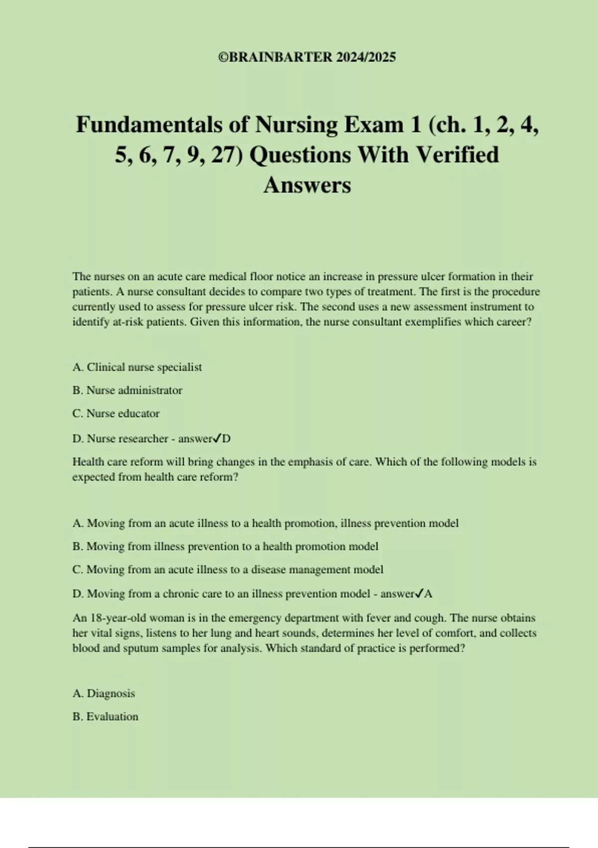 Fundamentals of Nursing Exam 1 (ch. 1, 2, 4, 5, 6, 7, 9, 27) Questions With Verified Answers The nurses on an acute care medical floor notice an increase in pressure ulcer formation in their patients. A nurse consultant decides to compare two types of treatment. The first is the procedure currently used to assess for pressure ulcer risk. The second uses a new assessment instrument to identify at-risk patients. Given this information, the nurse consultant exemplifies which career? A. Clinical nurse specialist B. Nurse administrator C. Nurse educator D. Nurse researcher - answerD Health care reform will bring changes in the emphasis of care. Which of the following models is expected from health care reform? A. Moving from an acute illness to a health promotion, illness prevention model B. Moving from illness prevention to a health promotion model C. Moving from an acute illness to a disease management model D. Moving from a chronic care to an illness prevention model - answerA An 18-year-old woman is in the emergency department with fever and cough. The nurse obtains her vital signs, listens to her lung and heart sounds, determines her level of comfort, and collects blood and sputum samples for analysis. Which standard of practice is performed? A. Diagnosis B. Evaluation ©BRAINBARTER 2024/2025 C. Assessment D. Implementation - answerC A nurse is caring for a patient with end-stage lung disease. The patient wants to go home on oxygen and be comfortable. The family wants the patient to have a new surgical procedure. The nurse explains the risk and benefits of the surgery to the family and discusses the patient's wishes with them. The nurse is acting as the patient's: A. Educator B. Advocate C. Caregiver D. Case manager - answerB A nurse meets with the registered dietician and physical therapist to develop a plan of care that focuses on improving nutrition and mobility for a patient. This is an example of which Quality and Safety in the Education of Nurses (QSEN) competency? A. Patient-centered care B. Safety C. Teamwork and collaboration D. Informatics - answerC You are preparing a presentation for your classmates regarding the clinical care coordination conference for a patient with terminal cancer. As part of the preparation you have your classmates read the Nursing Code of Ethics for Professional Registered Nurses. Your instructor asks the class why this document is important. Which of the following statements best describes this code? A. Improves self-health care B. Protects the patient's confidentiality C. Ensures identical care to all patients D. Defines the principles of right and wrong to provide patient care - answerD ©BRAINBARTER 2024/2025 Nurses in an acute care hospital are attending a unit based education program to learn how to use a new pressure-relieving device for patients at risk for pressure ulcers. This is which type of education? A. Continuing education B. Graduate education C. In-service education D. Professional Registered Nurse Education - answerC A patient in the emergency department has developed wheezing and shortness of breath. The nurse gives the ordered medicated nebulizer treatment now and in 4 hours. Which standard of practice is performed? A. Planning B. Evaluation C. Assessment D. Implementation - answerD Which of the following Internet resources available can assist consumers when comparing quality care measures? A. WebMD B. Hospital Compare C. Magnet Recognition Program D. Hospital Consumer Assessment of Healthcare E. The American Hospital Association's web page - answerB, D According to Benner, an expert nurse goes through five levels of proficiency. Identify them. - answer1. Novice 2. Advanced Beginner 3. Competent 4. Proficient