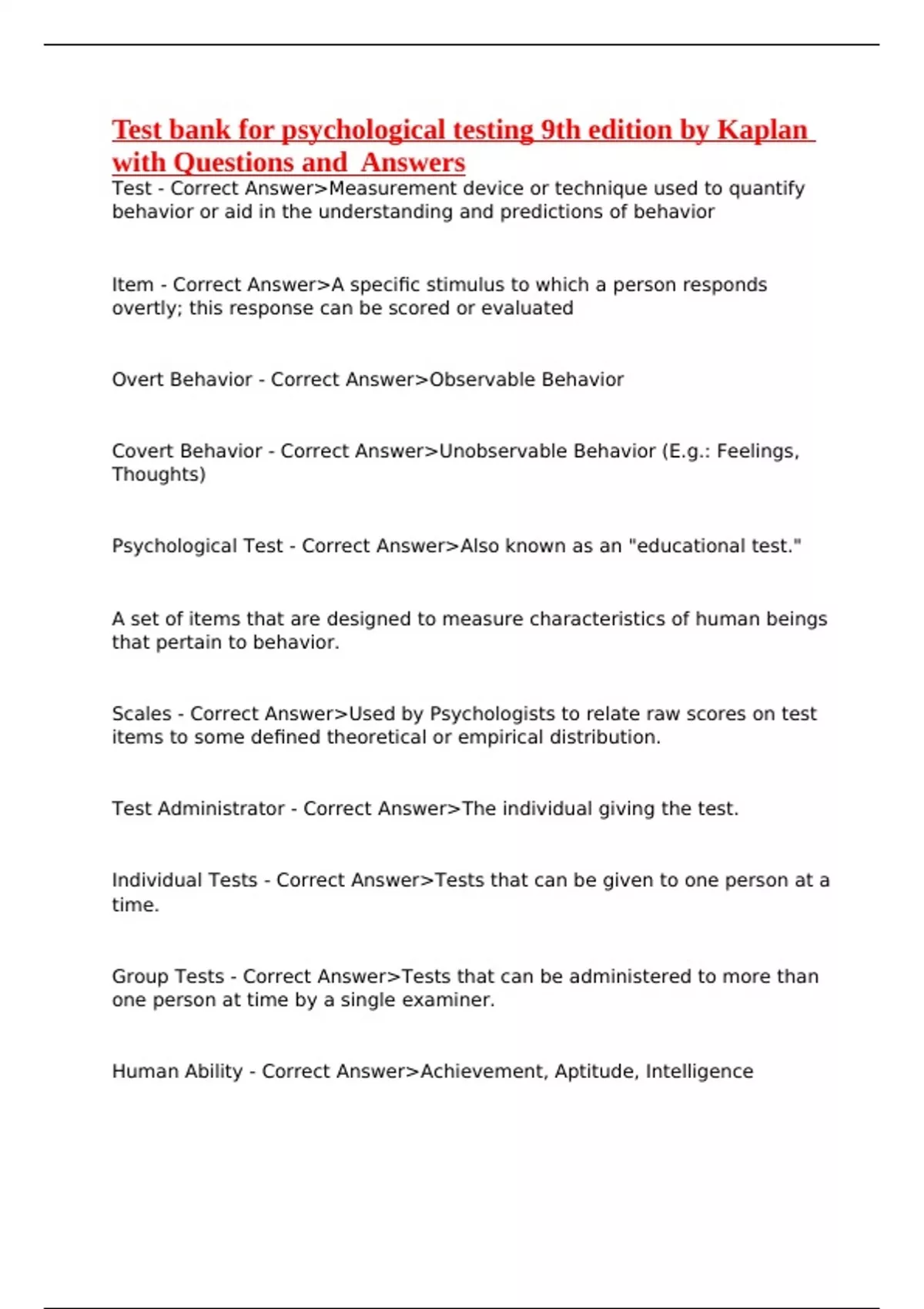 Test bank for psychological testing 9th edition by Kaplan with Questions and Answers Test - Correct AnswerMeasurement device or technique used to quantify behavior or aid in the understanding and predictions of behavior Item - Correct AnswerA specific stimulus to which a person responds overtly; this response can be scored or evaluated Overt Behavior - Correct AnswerObservable Behavior Covert Behavior - Correct AnswerUnobservable Behavior (E.g.: Feelings, Thoughts) Psychological Test - Correct AnswerAlso known as an "educational test." A set of items that are designed to measure characteristics of human beings that pertain to behavior. Scales - Correct AnswerUsed by Psychologists to relate raw scores on test items to some defined theoretical or empirical distribution. Test Administrator - Correct AnswerThe individual giving the test. Individual Tests - Correct AnswerTests that can be given to one person at a time. Group Tests - Correct AnswerTests that can be administered to more than one person at time by a single examiner. Human Ability - Correct AnswerAchievement, Aptitude, Intelligence Achievement - Correct AnswerRefers to previous learning. Aptitude - Correct AnswerRefers to potential learning. Personality Tests - Correct AnswerRelated to the overt and covert dispositions of the individual. Structured Personality Test - Correct AnswerProvides a statement, usually of the "self-report" variety and require the subject to choose between two or more alternative responses such as "True" or "False." Projective Personality Test - Correct AnswerIs generally unstructured. Either the stimulus or the required response or both are ambiguous (E.g.: The Rorschach Test). Psychological Testing - Correct AnswerRefers to all the possible uses, applications, and underlying concepts of psychological and educational tests. Reliability - Correct AnswerRefers to the accuracy, dependability, consistency, or repeatability of test results. In more technical terms, this principle refers to the degree to which test scores are free of measurement errors. Validity - Correct AnswerRefers to the meaning and usefulness of test results. More specifically, this principle refers to the degree to which a certain inference or interpretation based on a test is appropriate. Test Administration - Correct AnswerThe act of giving a test. Interview - Correct AnswerA method of gathering information through verbal interaction, such as direct questions. Not only is this method traditionally served as a major technique of gathering psychological information in general, but also data from interviews provides an important complement to test results. Test Batteries - Correct AnswerUsed by the Han Dynasty (206-220 B.C.E.). A type of test related to diverse topics such as civil law, military affairs, agriculture, revenue, and geography. It was later on developed by the Ming Dynasty ( C.E.) and turned it to a national multistage testing program involved local and regional testing centers equipped with testing booths.