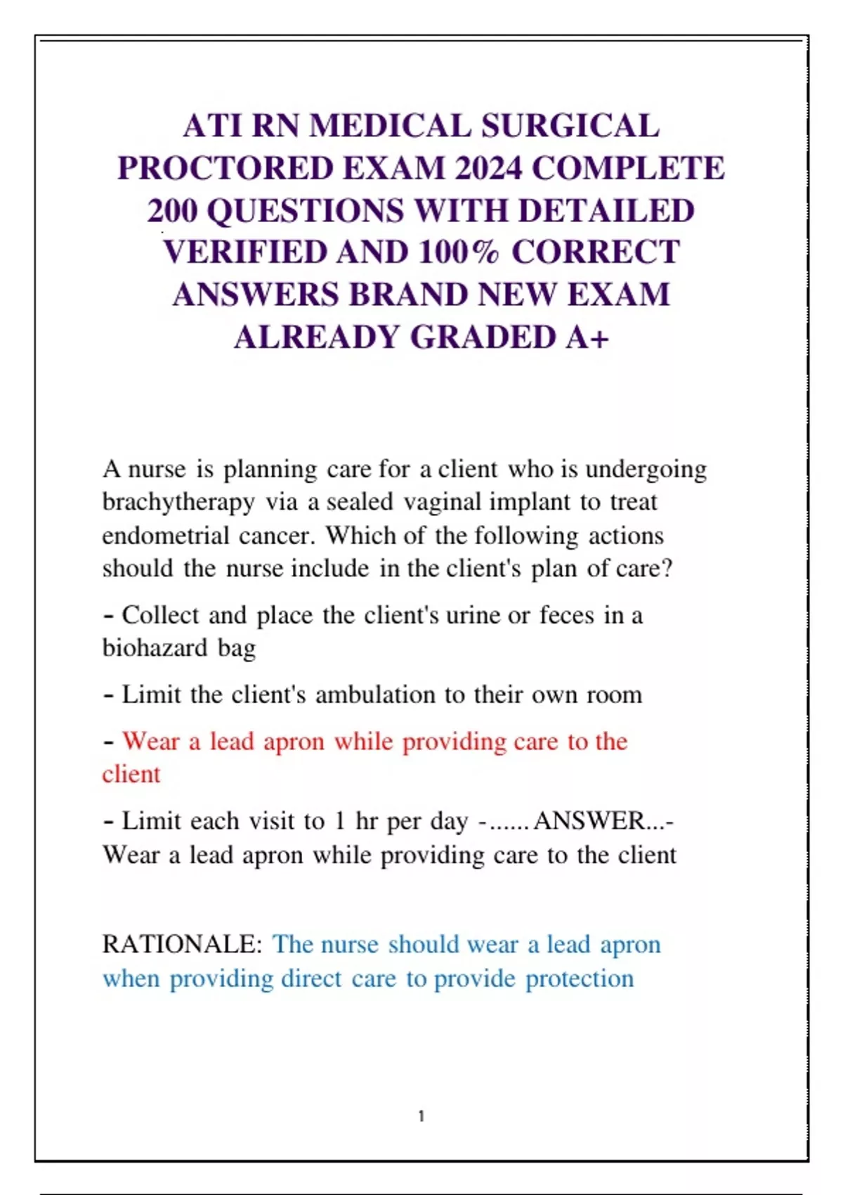ATI RN MEDICAL SURGICAL PROCTORED EXAM 2024 COMPLETE 200 QUESTIONS WITH DETAILED VERIFIED AND 100% CORRECT ANSWERS BRAND NEW EXAM ALREADY GRADED A+