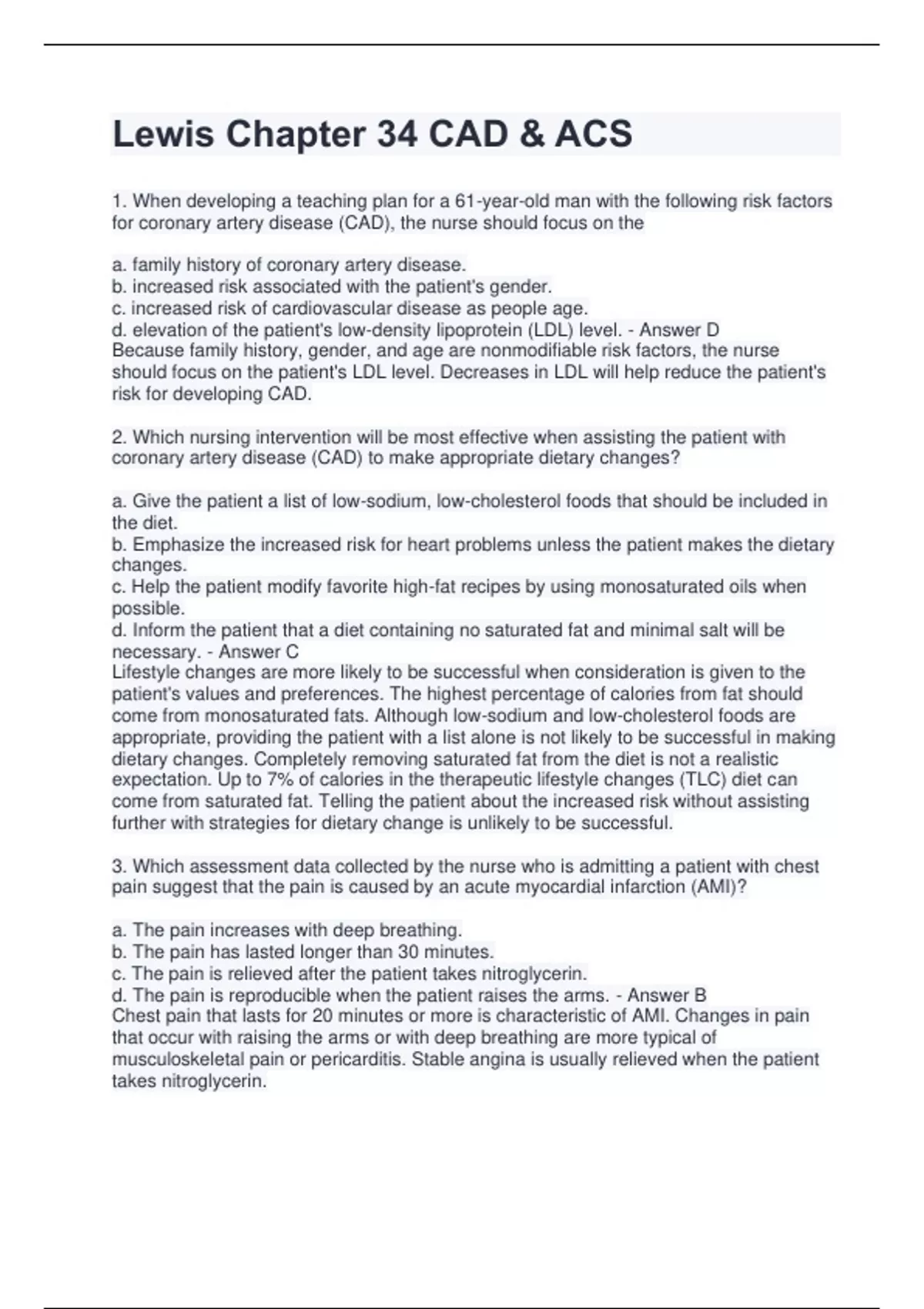 Lewis Chapter 34 CAD & ACS questions with complete answers