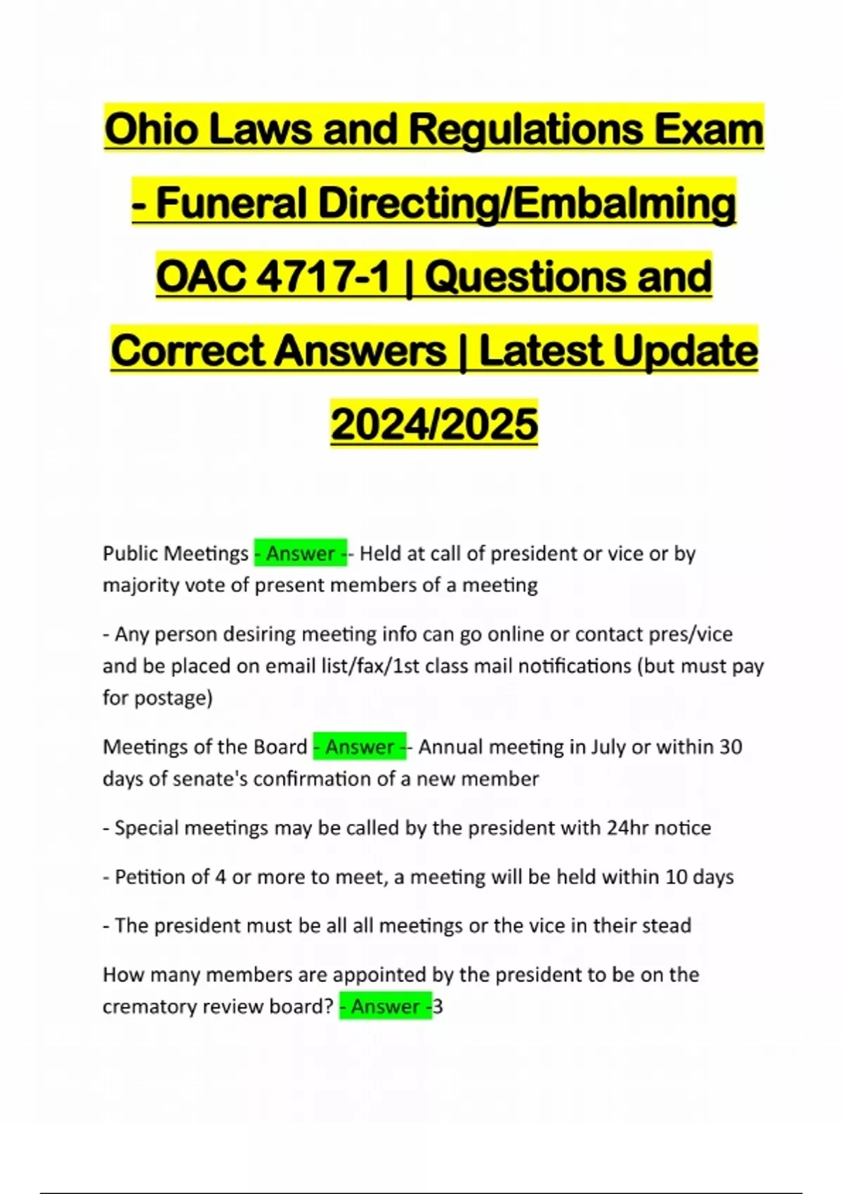 Ohio Laws and Regulations Exam - Funeral Directing/Embalming OAC 4717-1 | Questions and Correct Answers | Latest Update 2024/2025
