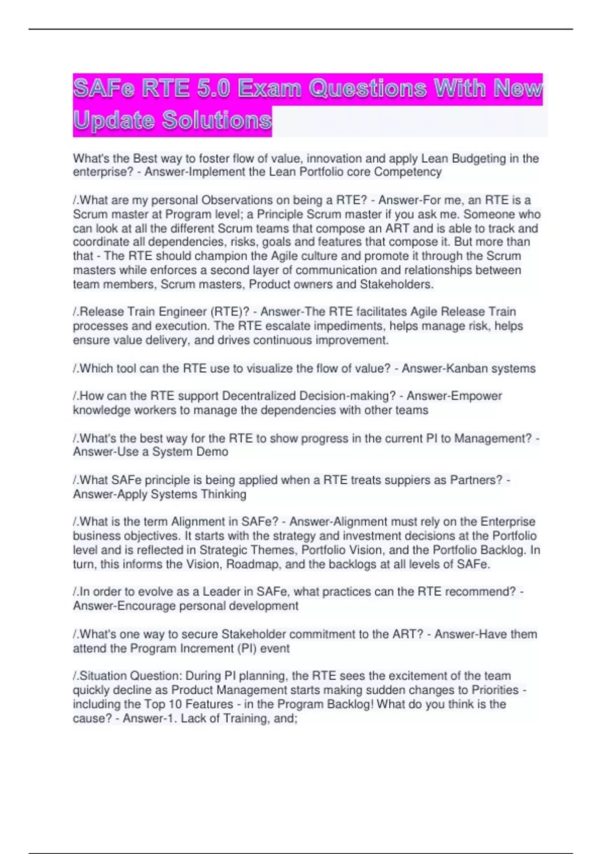 SAFe RTE 5.0 Exam Questions With New Update Solutions What's the Best way to foster flow of value, innovation and apply Lean Budgeting in the enterprise? - Answer-Implement the Lean Portfolio core Competency /.What are my personal Observations on being a RTE? - Answer-For me, an RTE is a Scrum master at Program level; a Principle Scrum master if you ask me. Someone who can look at all the different Scrum teams that compose an ART and is able to track and coordinate all dependencies, risks, goals and features that compose it. But more than that - The RTE should champion the Agile culture and promote it through the Scrum masters while enforces a second layer of communication and relationships between team members, Scrum masters, Product owners and Stakeholders. /.Release Train Engineer (RTE)? - Answer-The RTE facilitates Agile Release Train processes and execution. The RTE escalate impediments, helps manage risk, helps ensure value delivery, and drives continuous improvement. /.Which tool can the RTE use to visualize the flow of value? - Answer-Kanban systems /.How can the RTE support Decentralized Decision-making? - Answer-Empower knowledge workers to manage the dependencies with other teams /.What's the best way for the RTE to show progress in the current PI to Management? - Answer-Use a System Demo /.What SAFe principle is being applied when a RTE treats suppiers as Partners? - Answer-Apply Systems Thinking /.What is the term Alignment in SAFe? - Answer-Alignment must rely on the Enterprise business objectives. It starts with the strategy and investment decisions at the Portfolio level and is reflected in Strategic Themes, Portfolio Vision, and the Portfolio Backlog. In turn, this informs the Vision, Roadmap, and the backlogs at all levels of SAFe. /.In order to evolve as a Leader in SAFe, what practices can the RTE recommend? - Answer-Encourage personal development /.What's one way to secure Stakeholder commitment to the ART? - Answer-Have them attend the Program Increment (PI) event