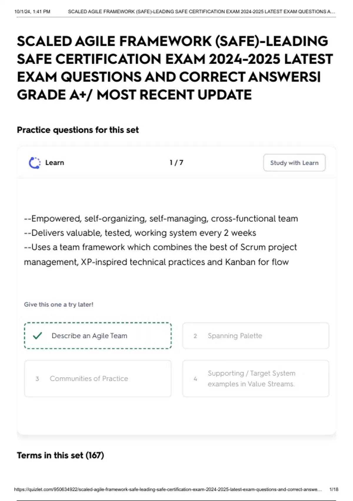 , 10/1/24, 1:41 PM SCALED AGILE FRAMEWORK (SAFE)-LEADING SAFE CERTIFICATION EXAM 2024-2025 LATEST EXAM QUESTIONS A…