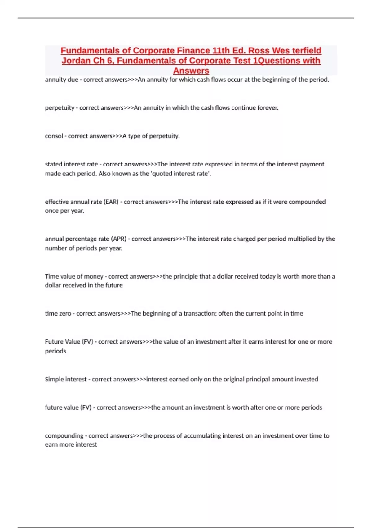 Fundamentals of Corporate Finance 11th Ed. Ross Wes terfield Jordan Ch 6, Fundamentals of Corporate Test 1Questions with Answers annuity due - correct answers>>>An annuity for which cash flows occur at the beginning of the period. perpetuity - correct answers>>>An annuity in which the cash flows continue forever. consol - correct answers>>>A type of perpetuity. stated interest rate - correct answers>>>The interest rate expressed in terms of the interest payment made each period. Also known as the 'quoted interest rate'. effective annual rate (EAR) - correct answers>>>The interest rate expressed as if it were compounded once per year. annual percentage rate (APR) - correct answers>>>The interest rate charged per period multiplied by the number of periods per year. Time value of money - correct answers>>>the principle that a dollar received today is worth more than a dollar received in the future time zero - correct answers>>>The beginning of a transaction; often the current point in time Future Value (FV) - correct answers>>>the value of an investment after it earns interest for one or more periods Simple interest - correct answers>>>interest earned only on the original principal amount invested future value (FV) - correct answers>>>the amount an investment is worth after one or more periods compounding - correct answers>>>the process of accumulating interest on an investment over time to earn more interest interest on interest - correct answers>>>interest earned on the reinvestment of previous interest payments simple interest - correct answers>>>interest earned only on the original principal amount invested present value (PV) - correct answers>>>the current value of future cash flows discounted as the appropriate discount rate discount - correct answers>>>calculate the present value of some future amount discount rate - correct answers>>>the rate used to calculate the present value of future cash flows discounted cash flow (DCF) valuation - correct answers>>>calculating the present value of a future cas flow to determine its value today. Compound annual growth rate - correct answers>>>the average annual growth rate over a specified period of time.