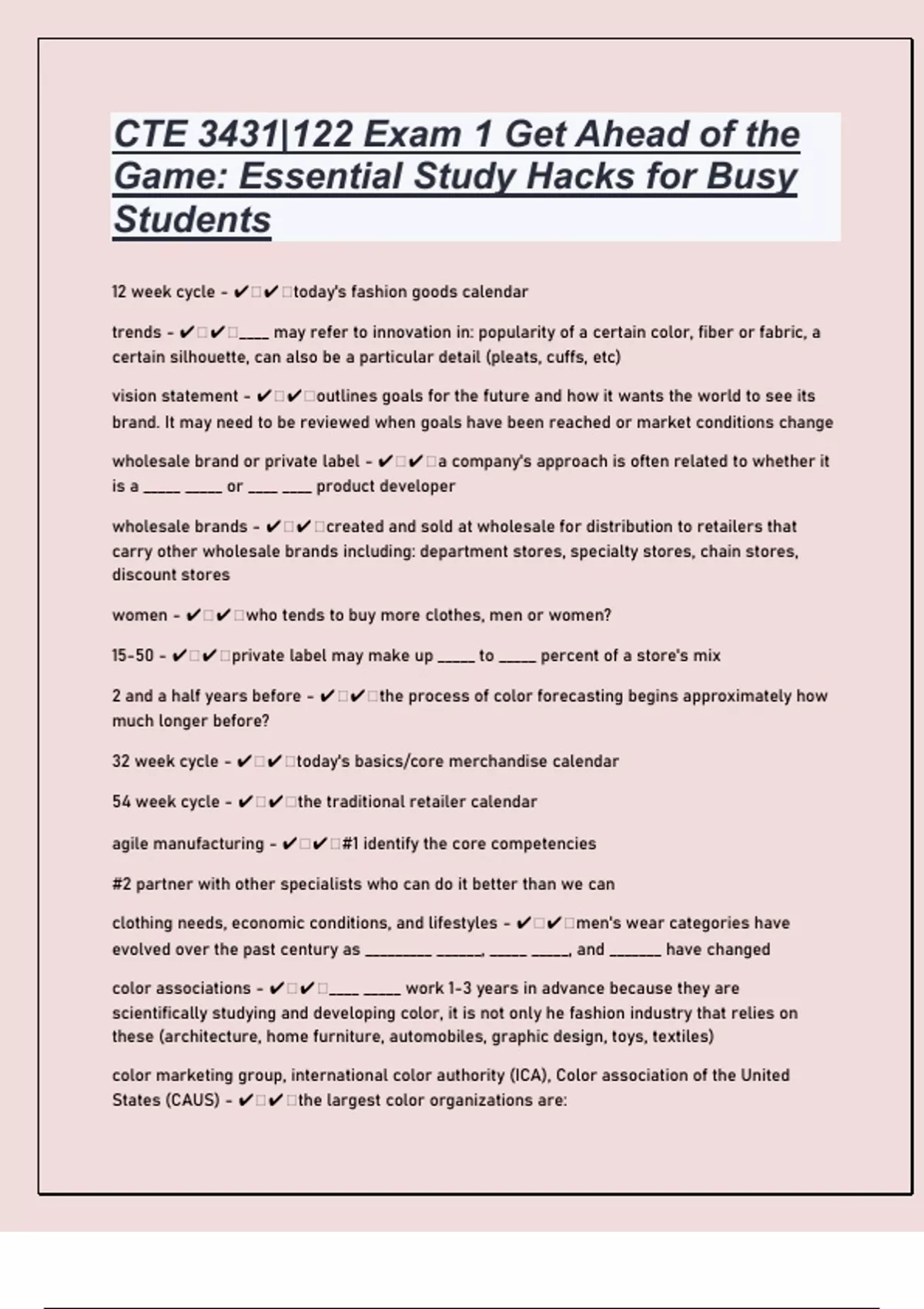 CTE 3431|122 Exam 1 Questions And Answers Get Ahead of the Game: Essential Study Hacks for Busy Students