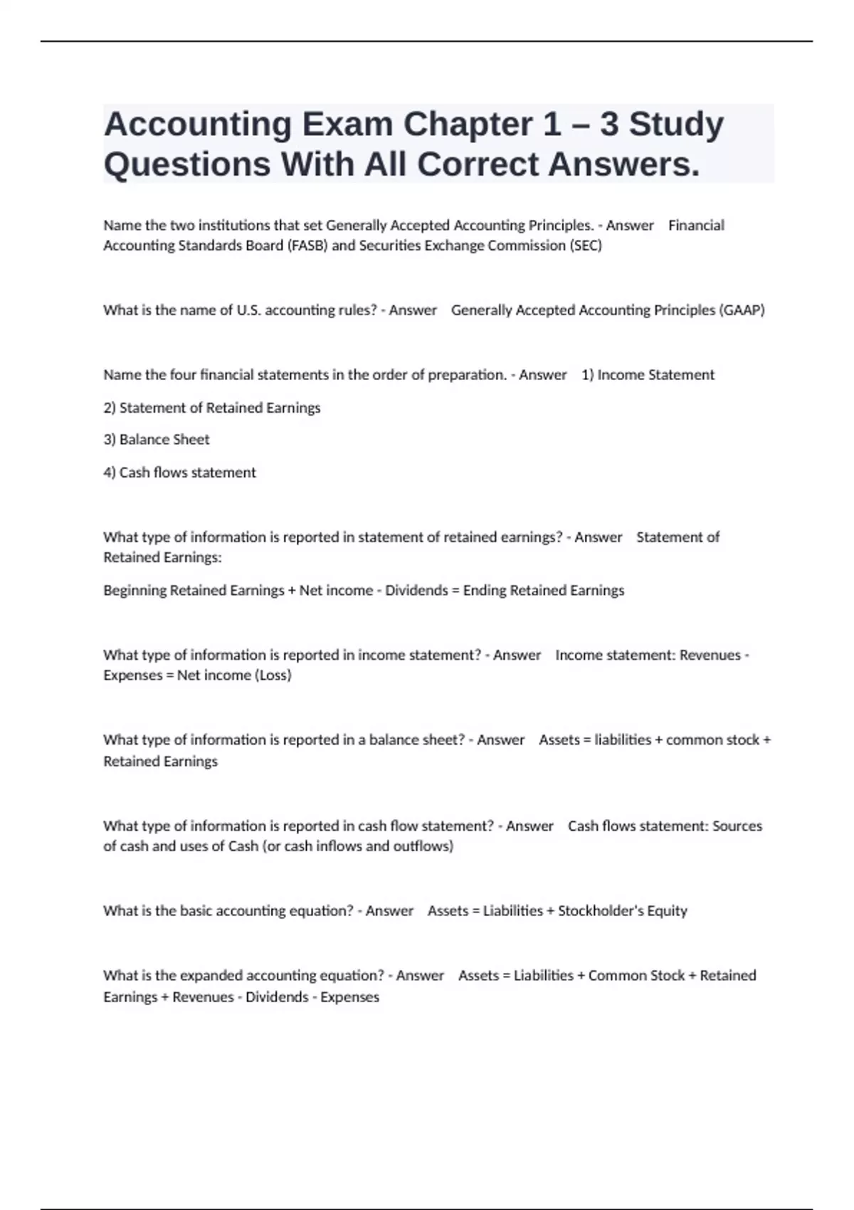 Name the two institutions that set Generally Accepted Accounting Principles. - Answer Financial Accounting Standards Board (FASB) and Securities Exchange Commission (SEC) What is the name of U.S. accounting rules? - Answer Generally Accepted Accounting Principles (GAAP) Name the four financial statements in the order of preparation. - Answer 1) Income Statement 2) Statement of Retained Earnings 3) Balance Sheet 4) Cash flows statement What type of information is reported in statement of retained earnings? - Answer Statement of Retained Earnings: Beginning Retained Earnings + Net income - Dividends = Ending Retained Earnings What type of information is reported in income statement? - Answer Income statement: Revenues - Expenses = Net income (Loss) What type of information is reported in a balance sheet? - Answer Assets = liabilities + common stock + Retained Earnings What type of information is reported in cash flow statement? - Answer Cash flows statement: Sources of cash and uses of Cash (or cash inflows and outflows) What is the basic accounting equation? - Answer Assets = Liabilities + Stockholder's Equity What is the expanded accounting equation? - Answer Assets = Liabilities + Common Stock + Retained Earnings + Revenues - Dividends - Expenses