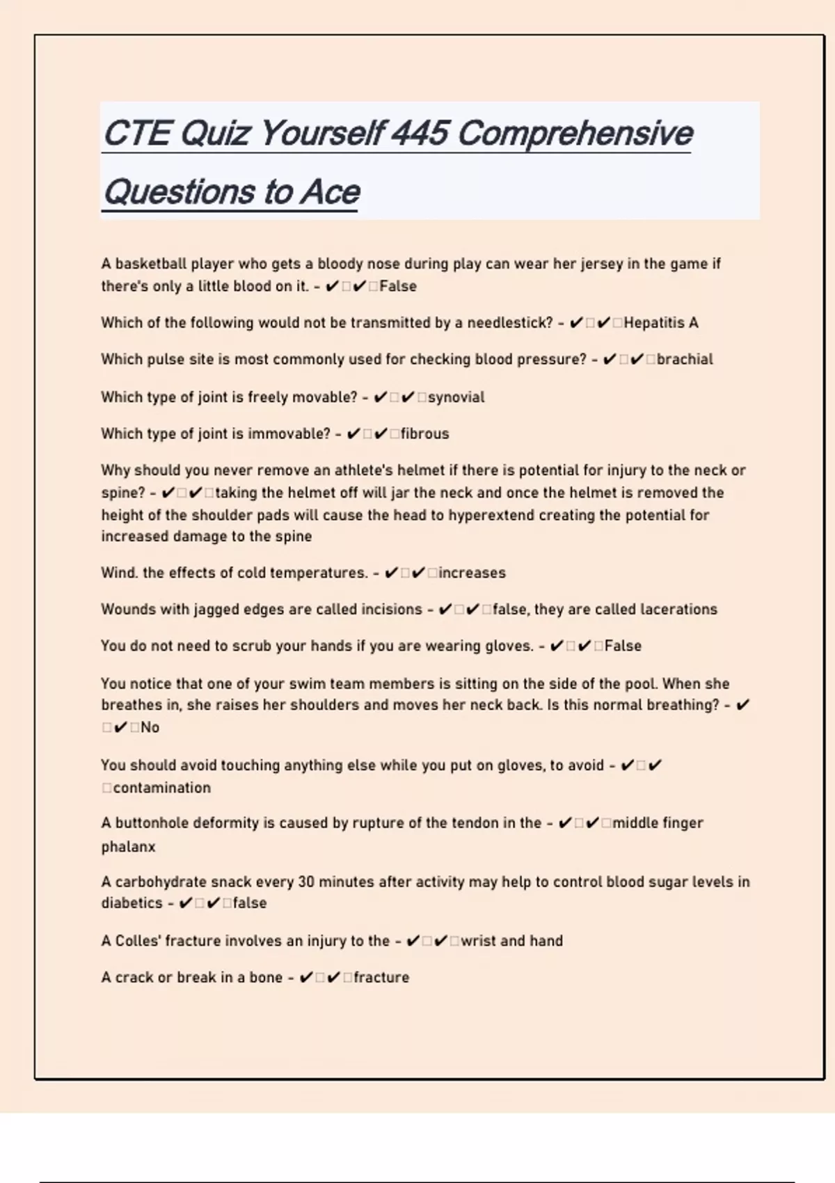 A basketball player who gets a bloody nose during play can wear her jersey in the game if there's only a little blood on it. - ️️False Which of the following would not be transmitted by a needlestick? - ️️Hepatitis A Which pulse site is most commonly used for checking blood pressure? - ️️brachial Which type of joint is freely movable? - ️️synovial Which type of joint is immovable? - ️️fibrous Why should you never remove an athlete's helmet if there is potential for injury to the neck or spine? - ️️taking the helmet off will jar the neck and once the helmet is removed the height of the shoulder pads will cause the head to hyperextend creating the potential for increased damage to the spine Wind. the effects of cold temperatures. - ️️increases Wounds with jagged edges are called incisions - ️️false, they are called lacerations You do not need to scrub your hands if you are wearing gloves. - ️️False You notice that one of your swim team members is sitting on the side of the pool. When she breathes in, she raises her shoulders and moves her neck back. Is this normal breathing? - ️️No You should avoid touching anything else while you put on gloves, to avoid - ️️contamination A buttonhole deformity is caused by rupture of the tendon in the - ️️middle finger phalanx A carbohydrate snack every 30 minutes after activity may help to control blood sugar levels in diabetics - ️️false A Colles' fracture involves an injury to the - ️️wrist and hand A crack or break in a bone - ️️fracture