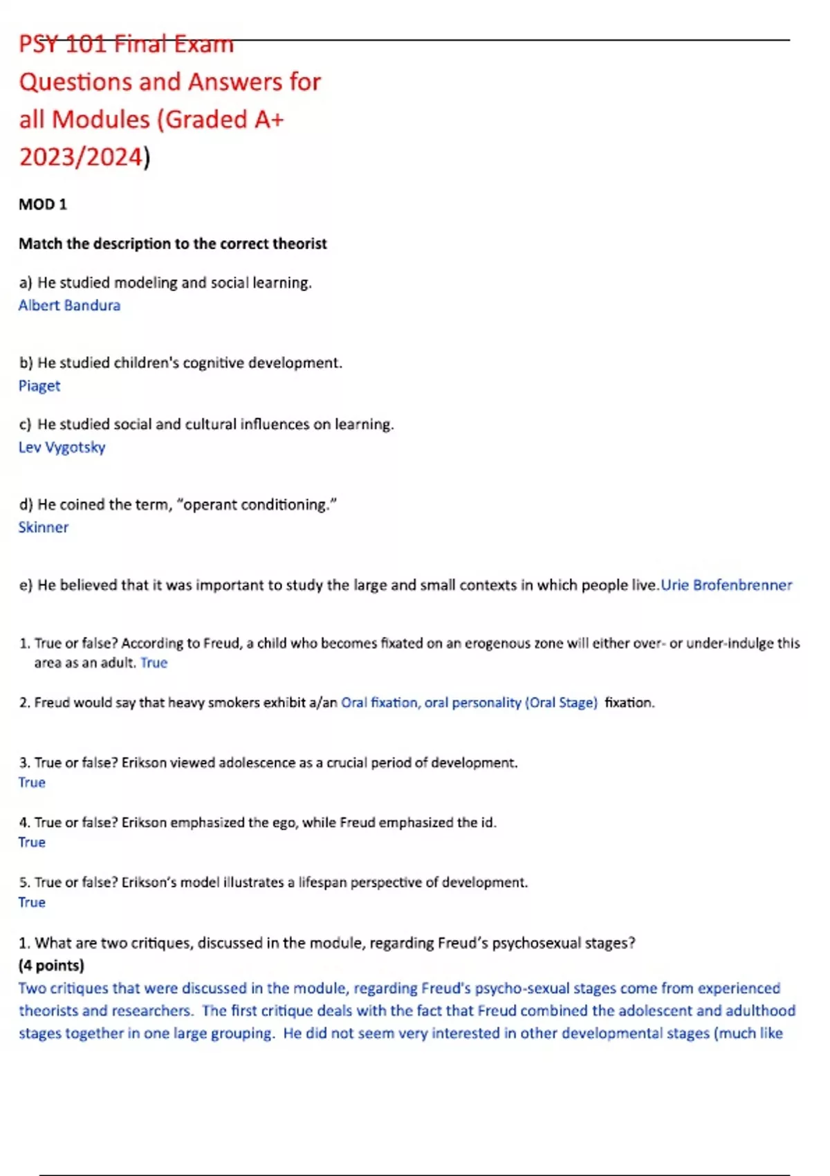 PSY 101 Final Exam Questions and Answers for all Modules (Graded A+ )